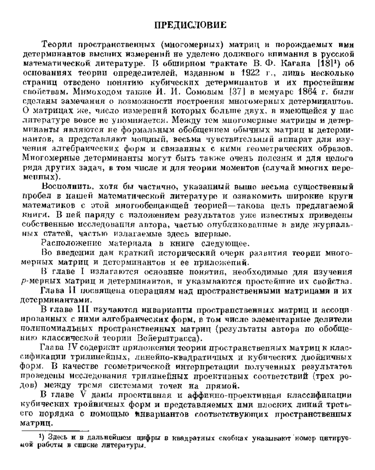 Предлагаемая книга представляет собой монографию, посвященную теории многомерных матриц и детерминантов и ее различным приложениям. В ней обобщаются основные результаты обычного матричного исчисления на случай пространства трех и большого числа измерений и рассматриваются вопросы, еще мало освещенные в русской математической литературе.
