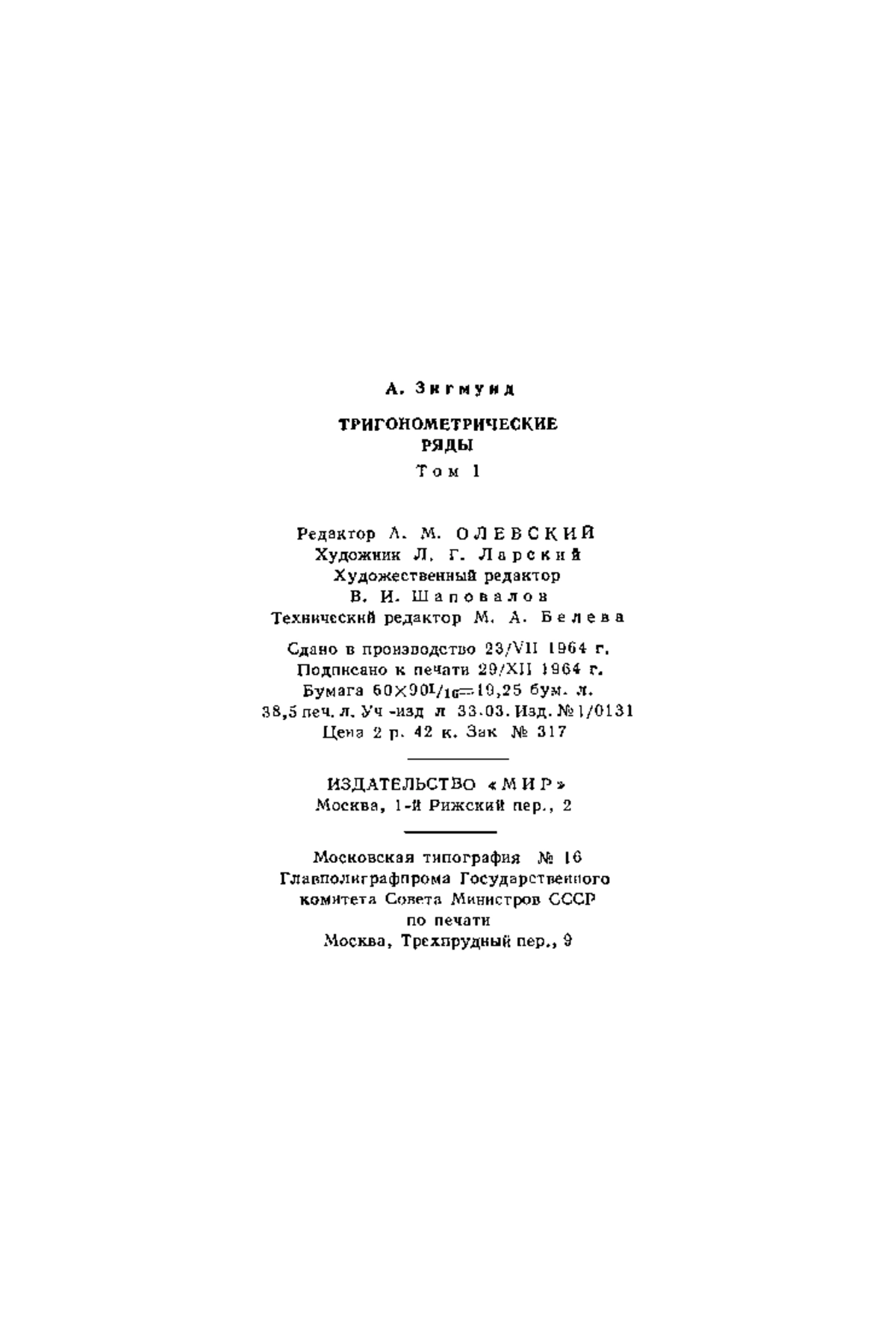 Настоящая книга А. Зигмунда и известная монография Н. К. Бари «Тригонометрические ряды» взаимно дополняют друга друга и, вместе взятые, могут быть рекомендованы студентам-математикам старших курсов и аспирантам различных специальностей как энциклопедия методов и фактов теории тригонометрических рядов.