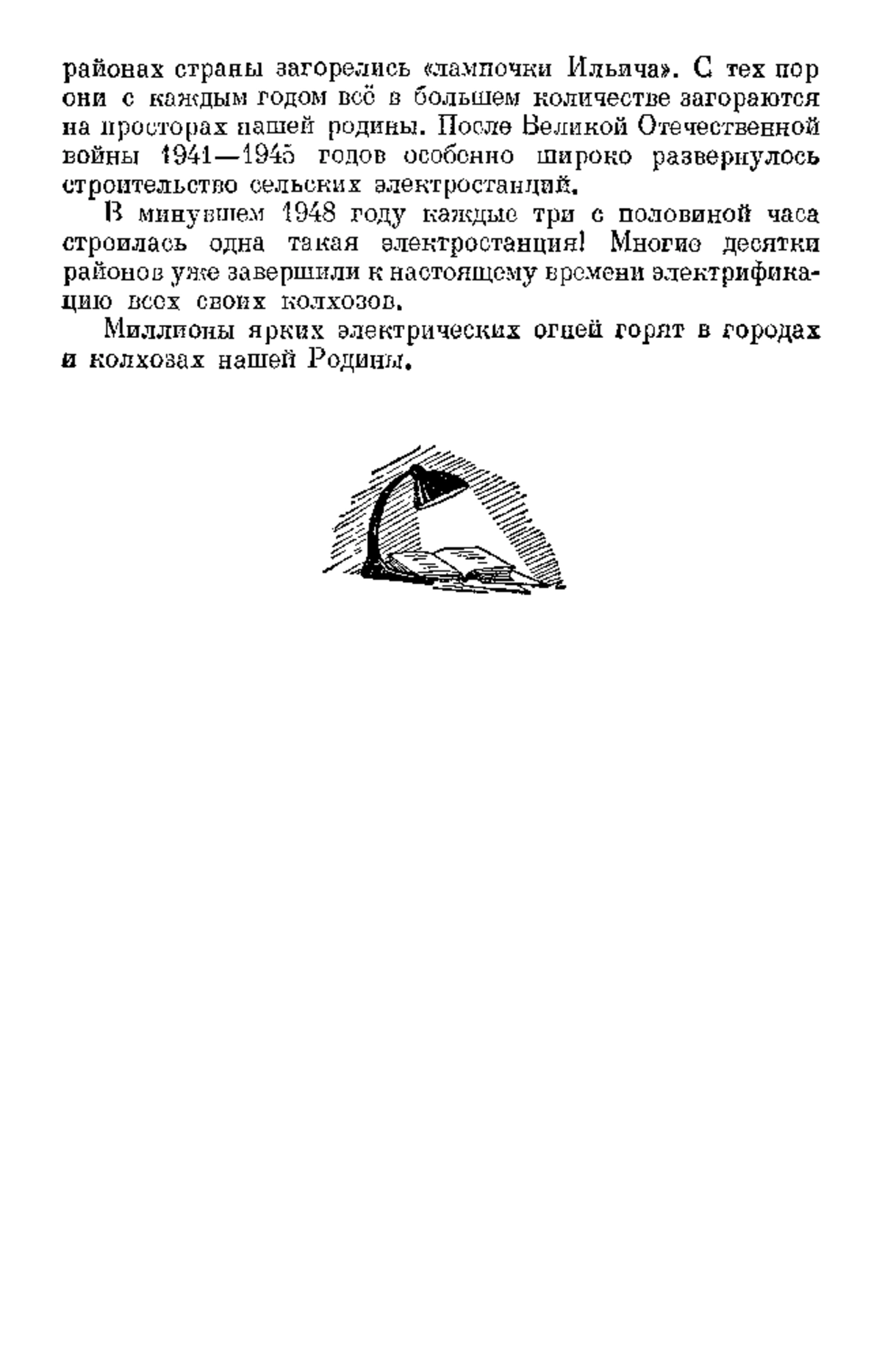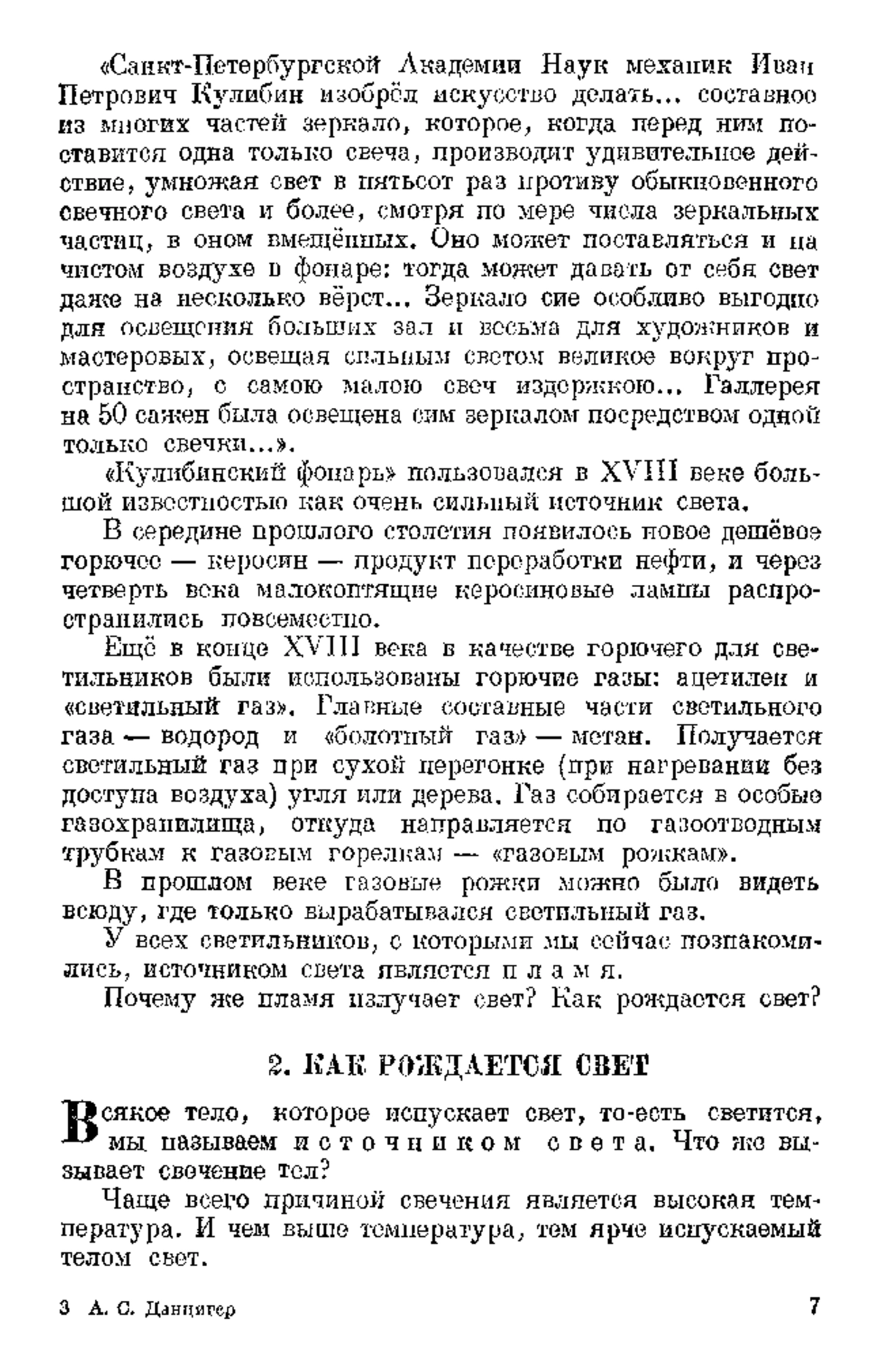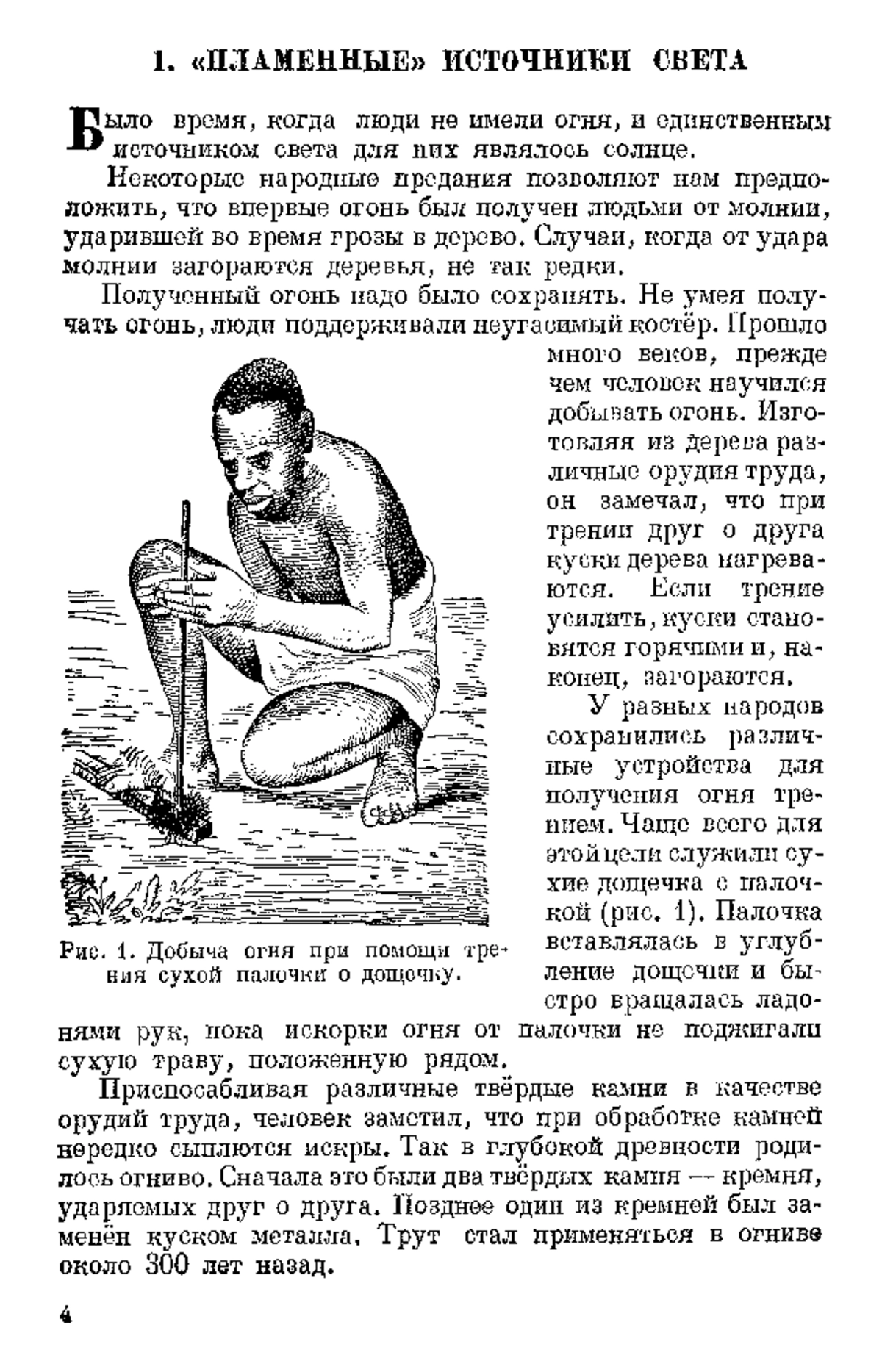 Кто не знает электрической лампочки! Мы видим её всюду — у себя дома и в поезде, на улице, в трамвае, на заводе и в театре, в шахте и на самолёте. Трудно перечислить все случаи применения этой лампы. Электрическое освещение стало для нас обычным. Однако было время — менее ста лет назад, — когда об электрическом свете, о «свете без огня», мечтали лишь немногие учёные. Много труда затратили они, чтобы создать электрическую лампочку — такую, какой мы её знаем теперь. Электрический свет пришёл в мир из России. В этом огромная, незабываемая заслуга русских учёных. Какой была первая электрическая лампочка? Как она постепенно совершенствовалась? Как устроена лампочка наших дней? Вот этим вопросам и посвящён наш небольшой очерк. Но прежде мы посмотрим, какими источниками света пользовались наши предки.
