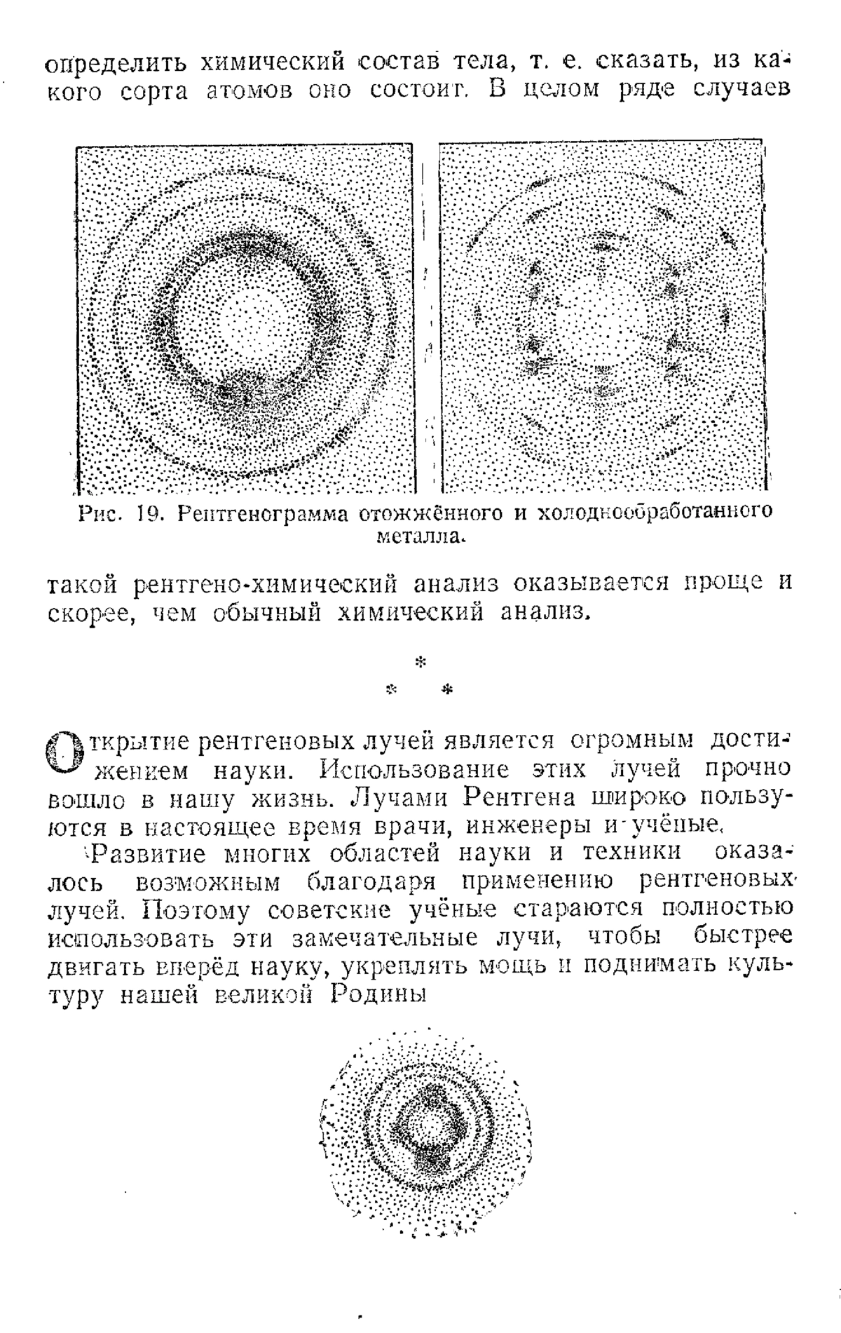 В данной книжке авторы расскажет об одном из таких открытий: о невидимых рентгеновых лучах. Эти замечательные лучи обладают способностью проходить сквозь вещества, непроницаемые для видимого света — сквозь металл, бумагу, кожу. Всевозможные оптические приборы: лупы, бинокли, микроскопы улучшают человеческое зрение, но с их помощью можно рассматривать только поверхность непрозрачных тел. Большинство же окружающих нас предметов — пласты земли, растения, металлы, тела людей и животных — непрозрачны. Между тем иногда бывает очень важно заглянуть внутрь какого-нибудь тела или предмета, не разрушая его. Например, в случае заболевания или повреждения внутренних органов, при переломах костей часто крайне необходимо заглянуть внутрь человеческого тела, осмотреть больные места. Это можно сделать с помощью рентгеновых лучей. Задачей настоящей книжки и является рассказать читателю о свойствах, природе и способах получения рентгеновых лучей; о том, какую пользу они приносят науке и технике.