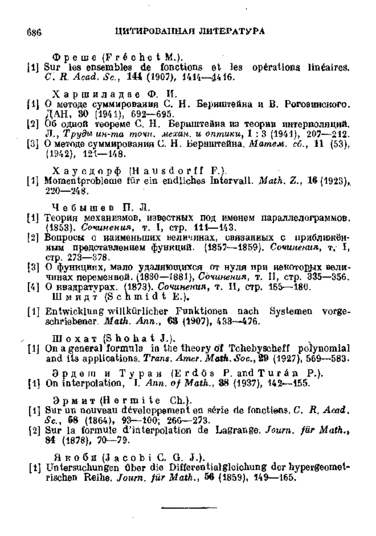 Конструктивная теория функций берёт своё начало в замечательных работах нашего великого математика П. Л. Чебышева по теории интерполирования, по механическим квадратурам, по проблеме моментов и особенно по многочленам, наименее уклоняющимся от заданной функции. Исследования П. Л. Чебышева были продолжены его учениками А. Н. Коркиным, Е. И. Золотарёвым, А. А. и В. А. Марковыми.