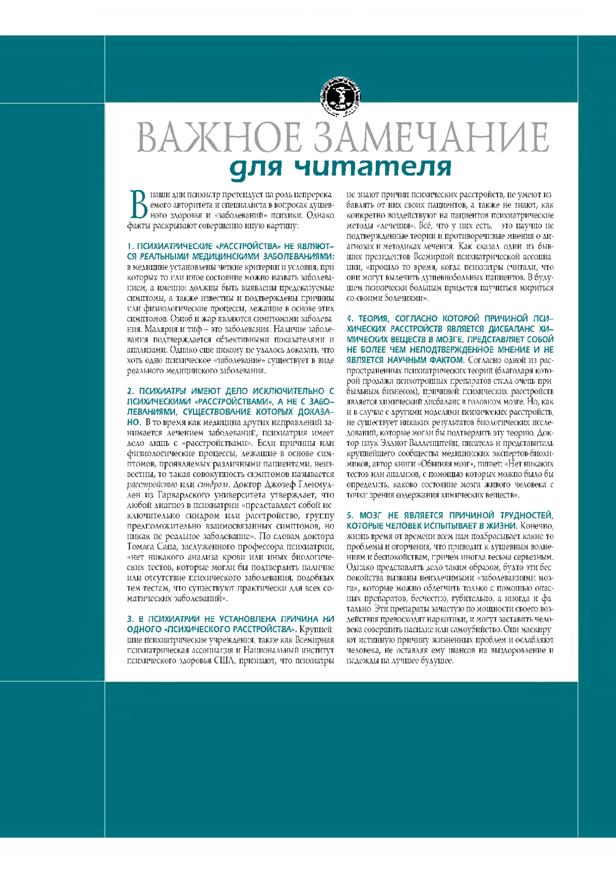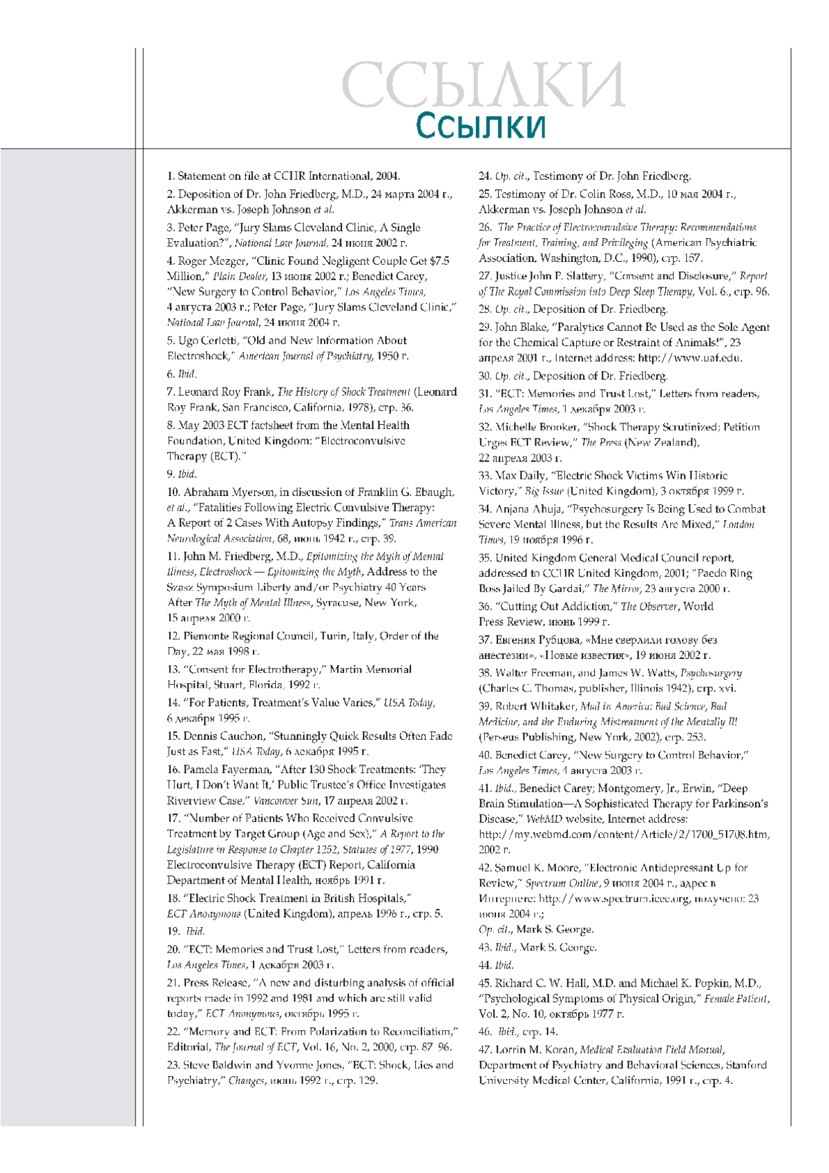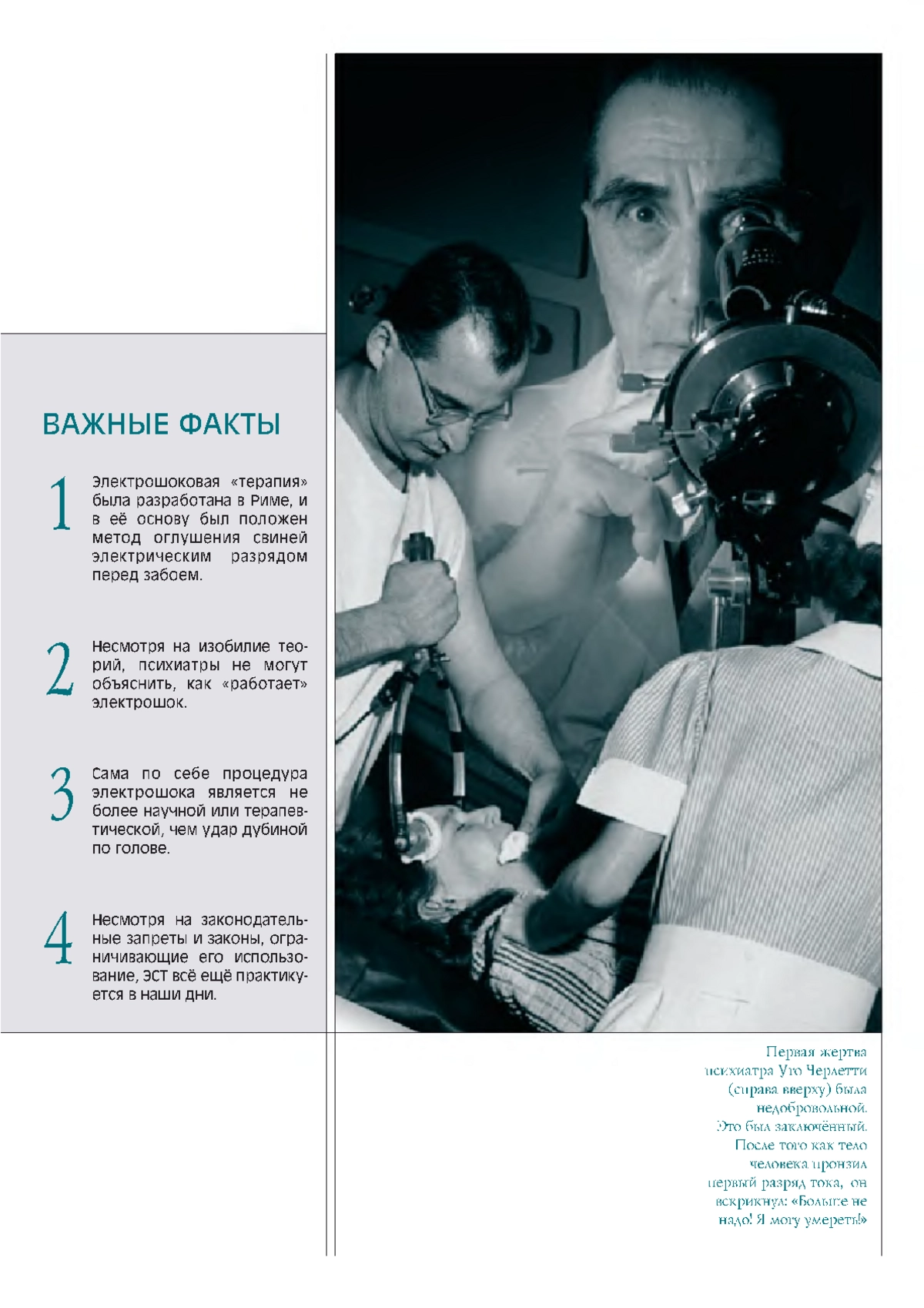 Электрошоковое лечение, известное также как электросудорожная терапия (ЭСТ), а также психохирургические «лечебные меры» по некоторым сообщениям завоёвывают свои прежние позиции. Однако, со времени своего зарождения эти процедуры сопровождаются конфликтом между психиатрами, которые расхваливают их, и многочисленными жертвами, чьи жизни были исковерканы при помощи этих методов. Являются ли ЭСТ и психохирургия полезными терапевтическими мерами, или это просто откровенная резня под видом лечения? Каждый, кто это видел, и содрогнулся от зрелища процедур ЭСТ и психохирургии, знает ответ достаточно хорошо. Этим процедурам свойственны все признаки физической пытки, они скорее напоминают приемы следователя тайной полиции, нежели «медицинского» работника. Видеокадры этих процедур были доступны очень немногим — в том числе и тем, кто законодательно дал зеленый свет их принудительному использованию. Книга раскрывает отрицательные стороны лечения электрошоком.