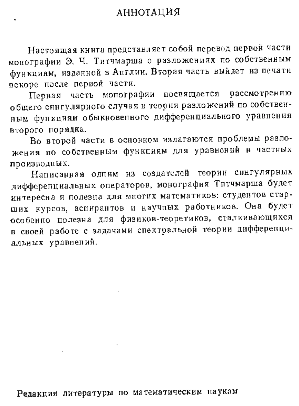 Настоящая книга представляет собой перевод первой части монографии Э. Ч. Титчмарша о разложениях по собственным функциям, изданной в Англии. Вторая часть выйдет из печати вскоре после первой части.