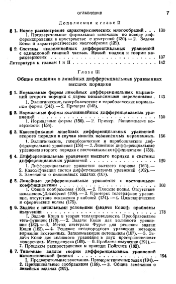 Этот том, в основном независимый от предыдущего, содержит систематическую теорию дифференциальных уравнений с частными производными, рассматриваемую с точки зрения математической физики. В последней, седьмой, главе приводятся на основе прямых методов вариационного исчисления доказательства существования решений для краевых задач и задач о собственных значениях эллиптических дифференциальных уравнений — в том объеме, в каком эти задачи встречались в предшествующем изложении.