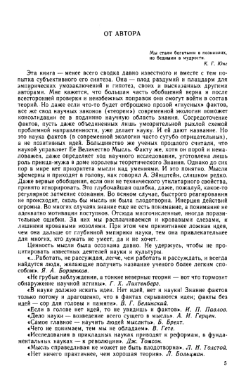 Рассмотрены широко известные и менее распространенные концепции современной «большой» экологии — ее теории, законы, правила, принципы и гипотезы в рамках иерархии природных систем. Особое внимание уделено социально-экономическим и другим прикладных аспектам науки, прежде всего ее роли в охране природы и рациональном использовании естественных ресурсов.