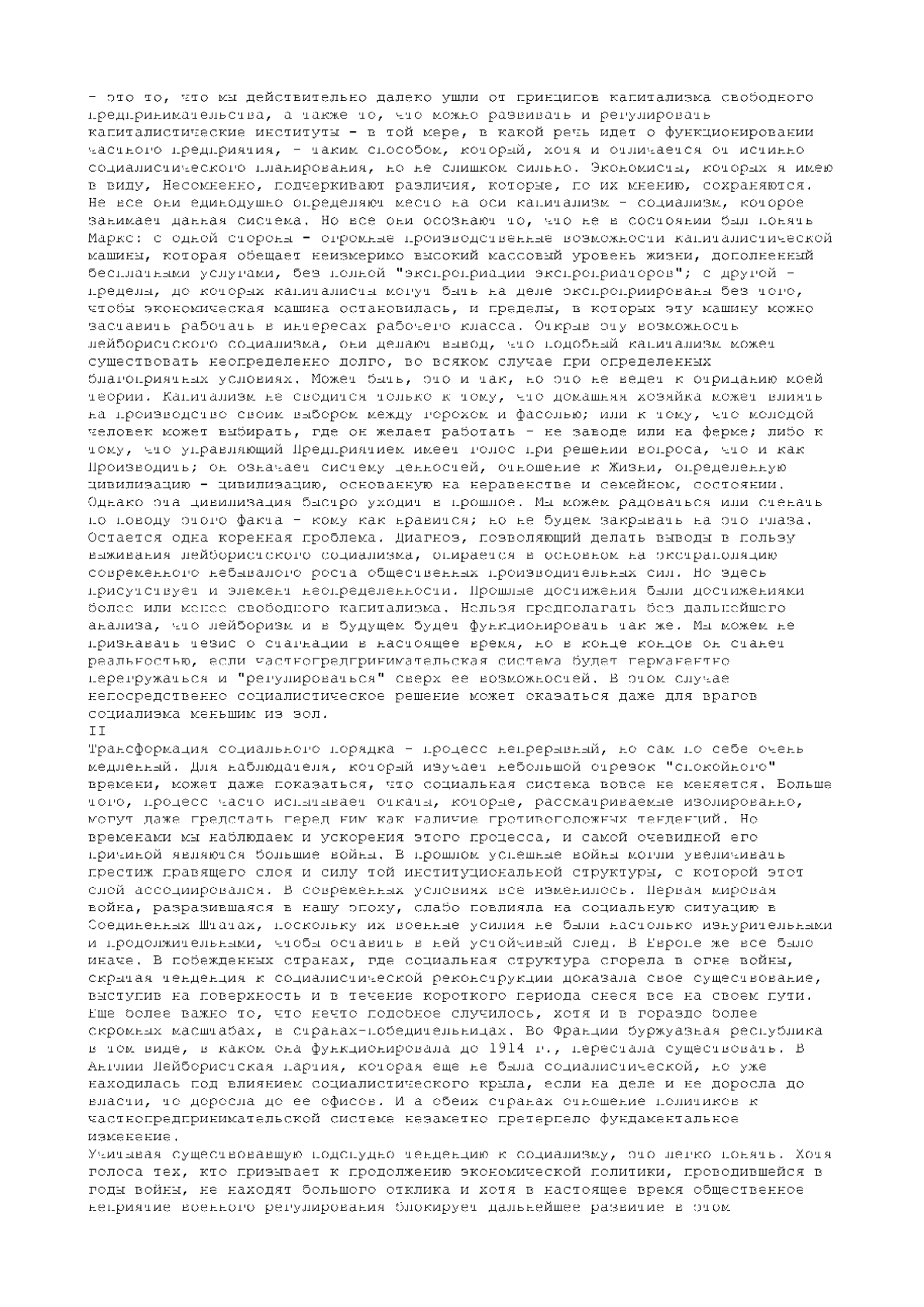 Содержание. “Несвоевременные” мысли Йозефа Шумпетера. Предисловие В. Автономова - Предисловие - Предисловие ко второму изданию - Предисловие к третьему изданию Часть первая. МАРКСИСТСКАЯ ДОКТРИНА - Пролог - Глава I. Маркс - пророк - Глава II. Маркс - социолог - Глава III. Маркс - экономист - Глава IV. Маркс - учитель - Часть вторая. МОЖЕТ ЛИ КАПИТАЛИЗМ ВЫЖИТЬ? - Пролог - Глава V. Темпы роста совокупного продукта - Глава VI. Возможность капитализма - Глава VII. Процесс “созидательного разрушения” - Глава VIII. Монополистическая практика - Глава IX. Передышка для пролетариата - Глава X. Исчезновение инвестиционных возможностей -Глава XI. Капиталистическая цивилизация - Глава XII. Разрушение стен - 1. Отмирание предпринимательской функции - 2. Разрушение защитного слоя - 3. Разрушение институциональной структуры капиталистического общества - Глава XIII. Растущая враждебность - 1. Социальная атмосфера капитализма - 2. Социология Интеллектуалов - Глава XIV. Разложение - Часть третья. МОЖЕТ ЛИ СОЦИАЛИЗМ РАБОТАТЬ? - Глава XV. Исходные позиции - Глава XVI. Социалистический проект - Глава XVII. Сравнительный анализ проектов общественного устройства - 1. Предварительные замечания - 2. Сравнительный анализ экономической эффективности - 3. Обоснование преимуществ социалистического проекта - Глава XVIII. Человеческий фактор - Предупреждение - 1. Историческая относительность всякой аргументации - 2. О полубогах и архангелах - 3. Проблема бюрократического управления - 4. Сбережения и дисциплина - 5. Авторитарная дисциплина при социализме: урок, преподанный Россией - Глава XIX. Переход к социализму - 1. Две самостоятельные проблемы - 2. Социализация в условиях зрелости - 3. Социализация на стадии незрелости - 4. Политика социалистов до провозглашения социализма: пример Англии - Часть четвертая. СОЦИАЛИЗМ И ДЕМОКРАТИЯ - Глава XX. Постановка проблемы - 1. Диктатура пролетариата - 2. Опыт социалистических партий - 3. Мысленный эксперимент - 4. В поисках определения - Глава XXI. Классическая доктрина демократии - 1. Общее благо и во