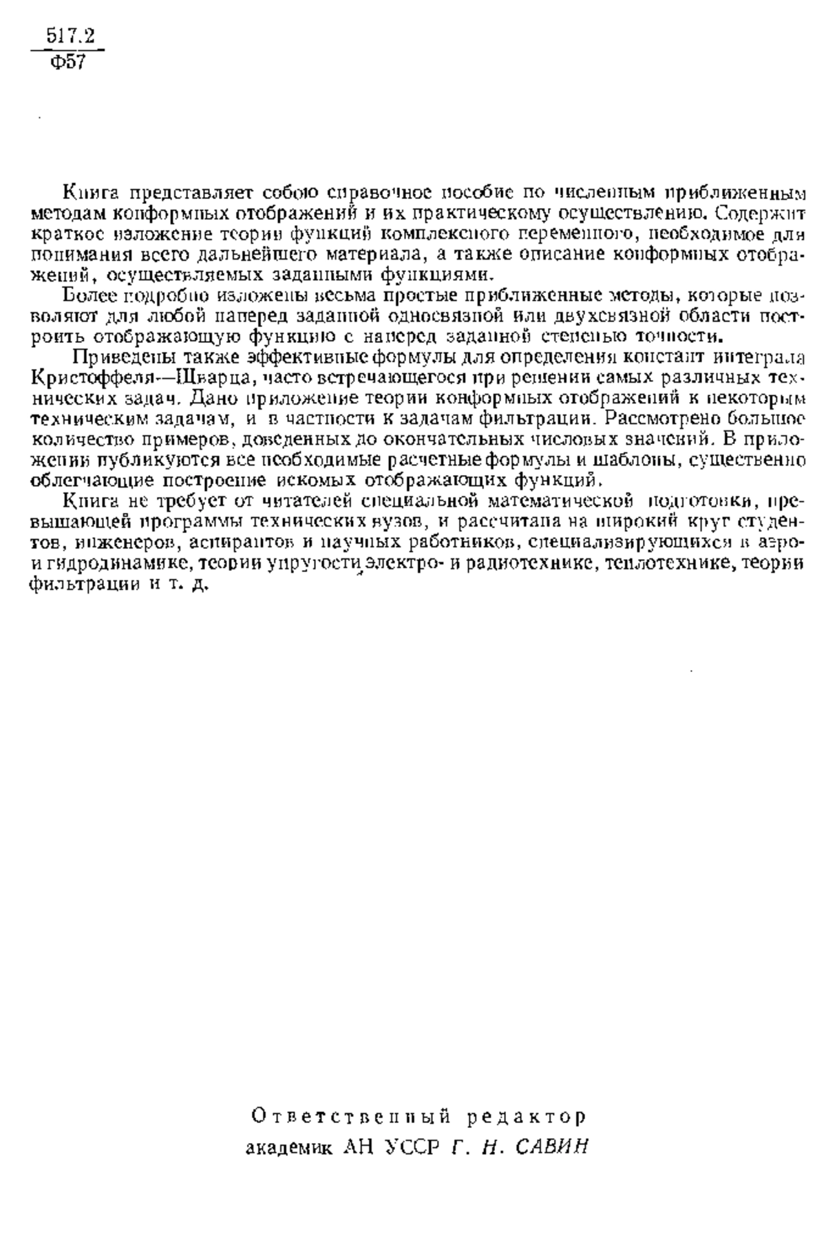 Приведены также эффективные формулы для определения констант интеграла Кристоффеля — Шварца, часто встречающегося при решении различных технических задач. Дано приложение теории конформных отображений к некоторым техническим задачам, и в частности к задачам фильтрации. Рассмотрено большое количество примеров, доведенных до окончательных числовых значений. В опущении публикуются все необходимые расчетные формулы и шаблоны, существенно облегчающие построение искомых отображающих функций.