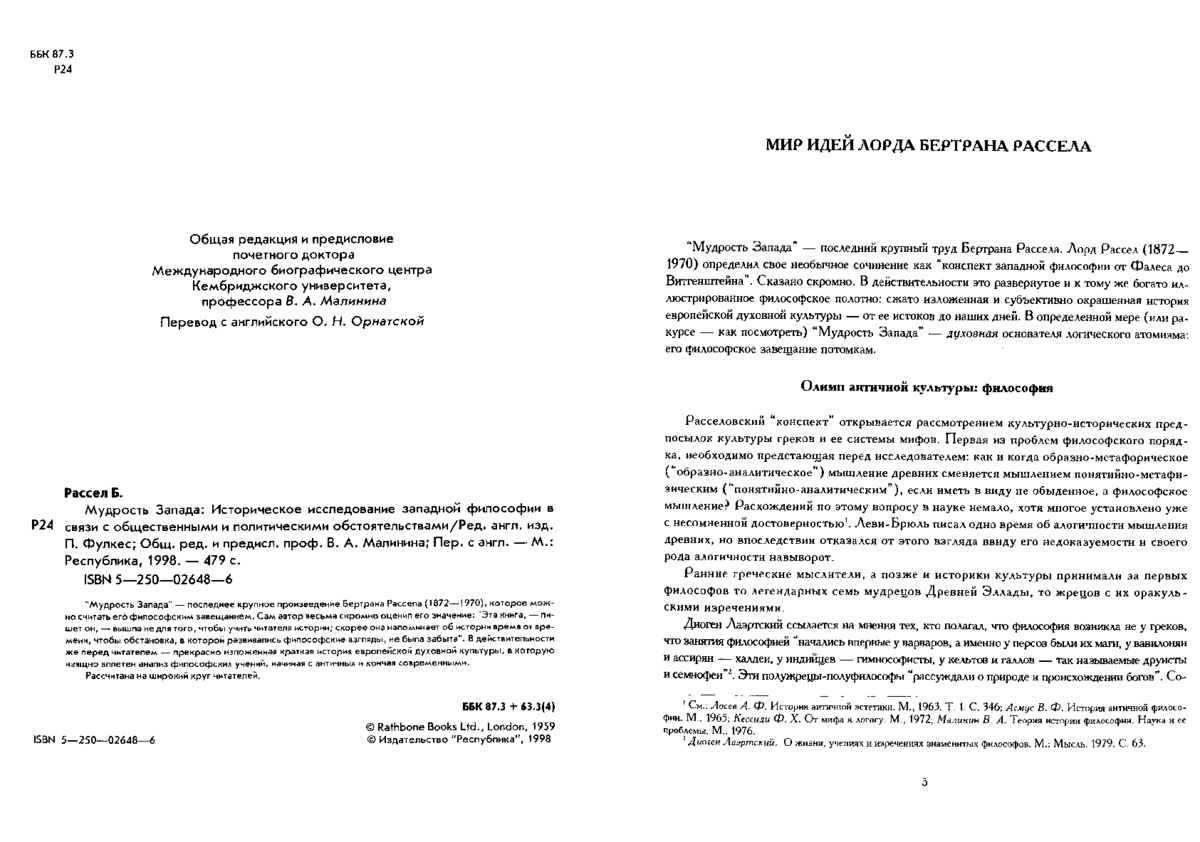«Мудрость запада» - последнее крупное произведение Бертрана Рассела (1872-1970), которое можно считать философским завещанием. Сам автор весьма скромно оценил его значение: «Эта книга, - пишет он, - вышла не для того, чтобы учить читателя истории; скорее она напоминает об истории время от времени, чтобы обстановка, в которой развивались философские взгляды, не была забыта». В действительности же перед читателем – прекрасно изложенная краткая история европейской духовной культуры, в которую изящно вплетен анализ философских учений, начиная с античных и кончая современными. Рассчитана на широкий круг читателей.