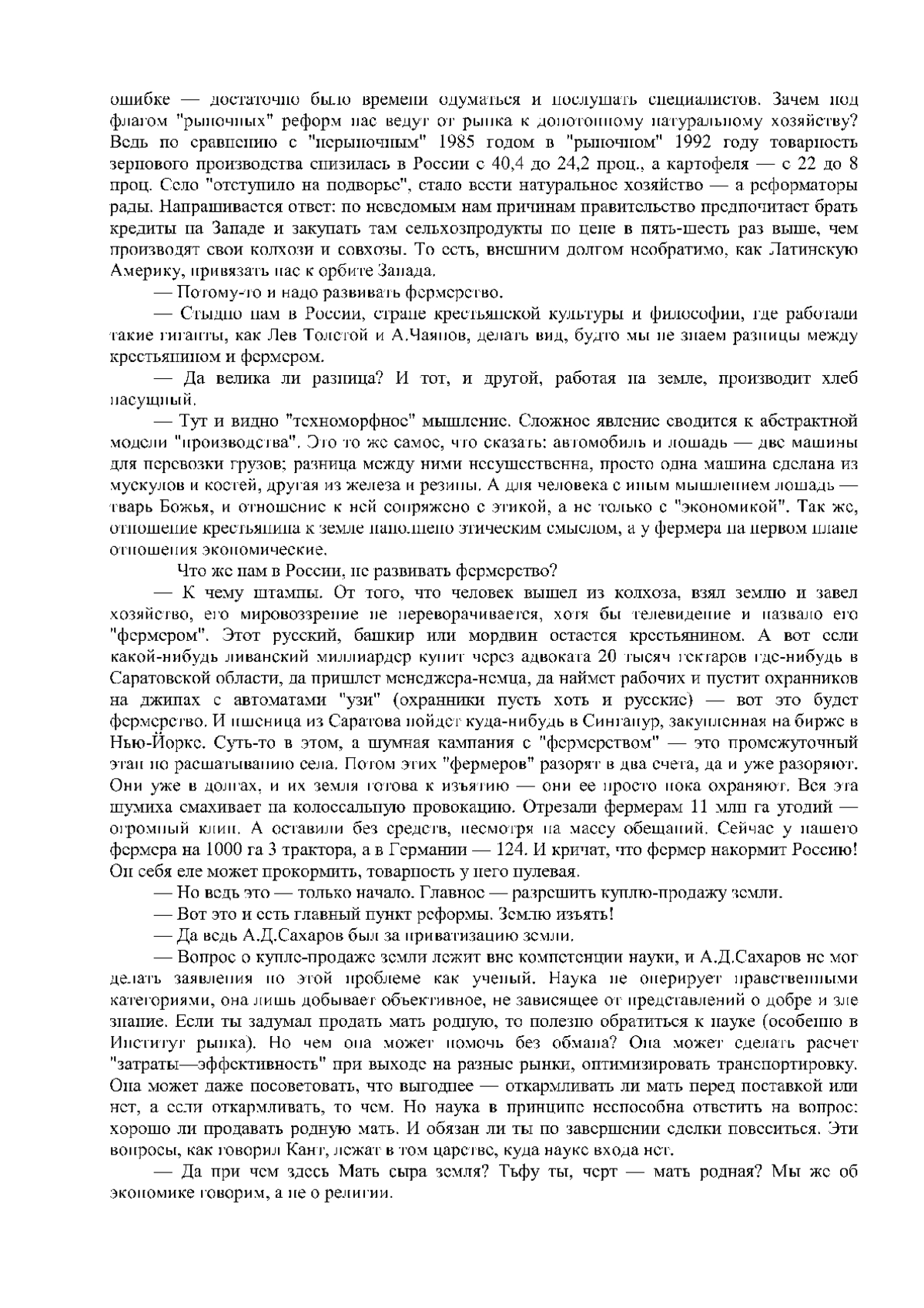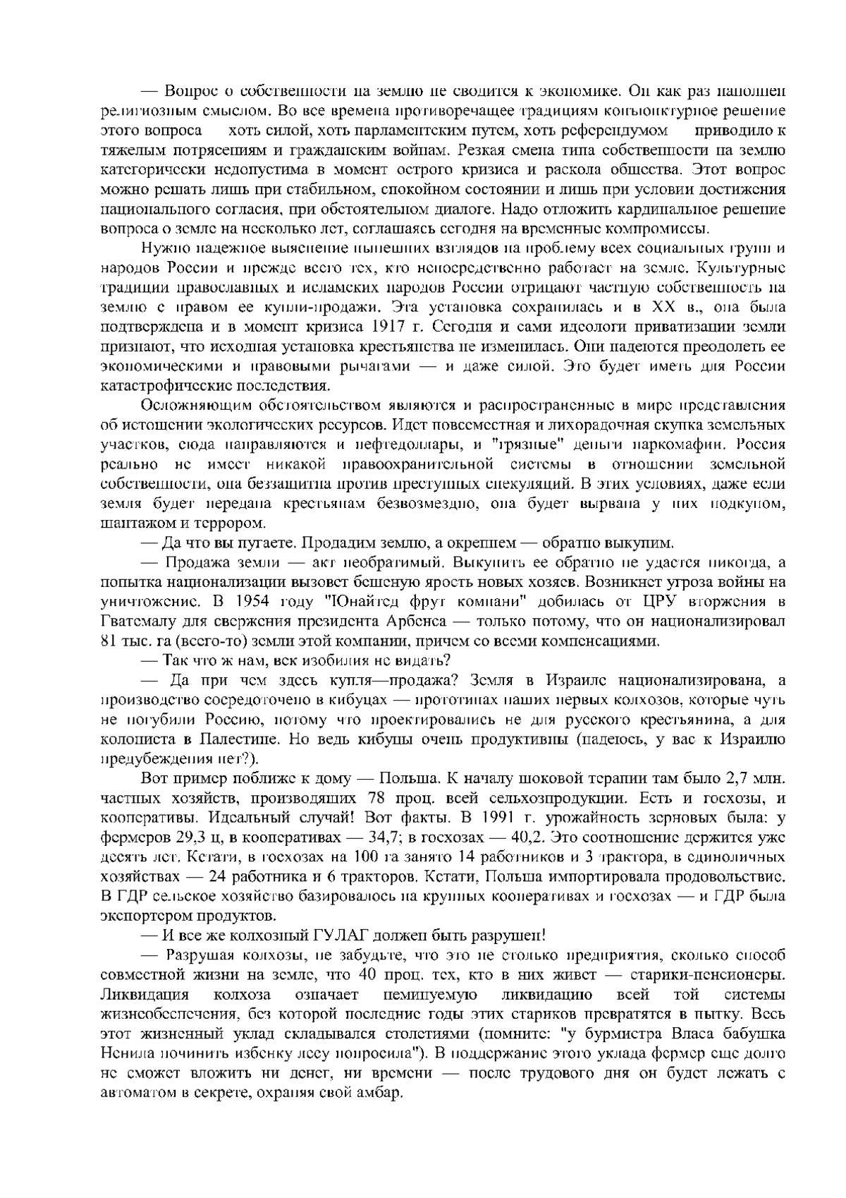 От автора: «В России идет переустройство всего строя жизни. Ясного понимания сути, однако, нет. В чем суть этого проекта, на Ваш взгляд? Капитализм, что ли, строим? Капитализм - это бы неплохо. Да не о нем речь. Сначала надо выяснить, почему же людям непонятна суть проекта - ведь из этого многие беды и вытекают. А дело в том, что уже с 60-х годов все осмысление идет исключительно в русле западной общественной мысли. Уже это раскалывает Россию, где тюркские, угорские и монгольские народы воспитаны в совершенно ином мироощущении, а русский народ - в весьма ином. Что же означает такой евроцентризм, вера в то, что существует одна “столбовая дорога цивилизации”, и эту дорогу для всех проложил Запад?»
