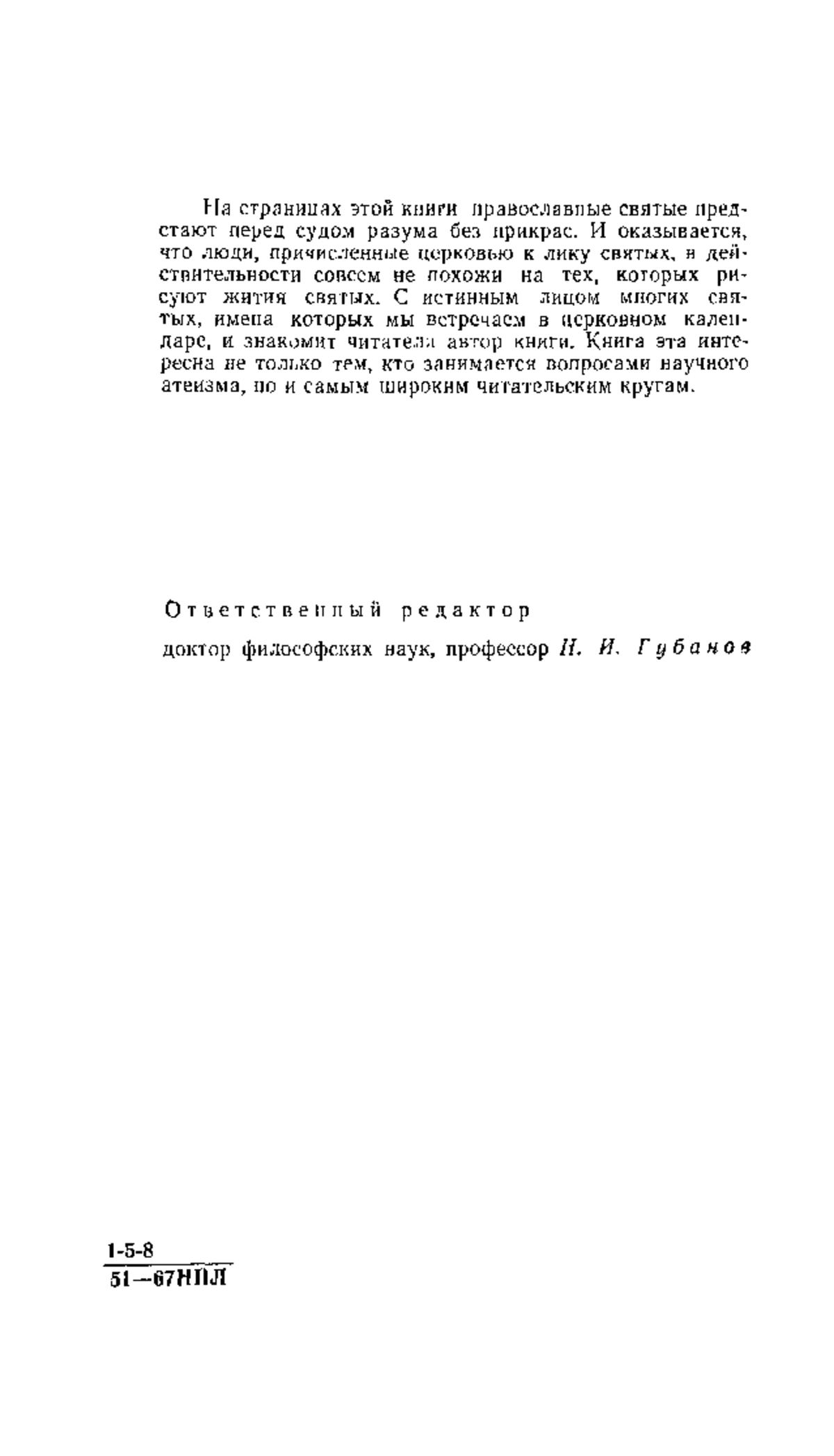 На страницах этой книги православные святые предстают перед судом разума без прикрас. И оказывается, что люди, причисленные церковью к лику святых, в действительности совсем не похожи на тех, которых рисуют жития святых. С истинным лицом многих святых, имена которых мы встречаем в церковном календаре, и знакомит читателя автор книги. Книга эта интересна не только тем, кто занимается вопросами научного атеизма, но и самым широким читательским кругам.