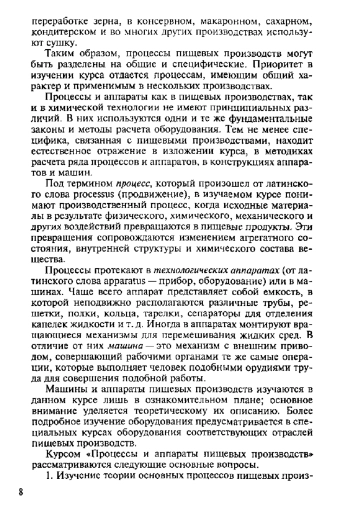 Изложены методы исследования процессов пищевых производств. Даны необходимые сведения о гидравлических, гидромеханических, тепловых, массообменных, физико-химических и механических процессах. Рассмотрено оборудование, предназначенное для реализации основных процессов пищевых производств. Приведены методы его инженерного расчета.