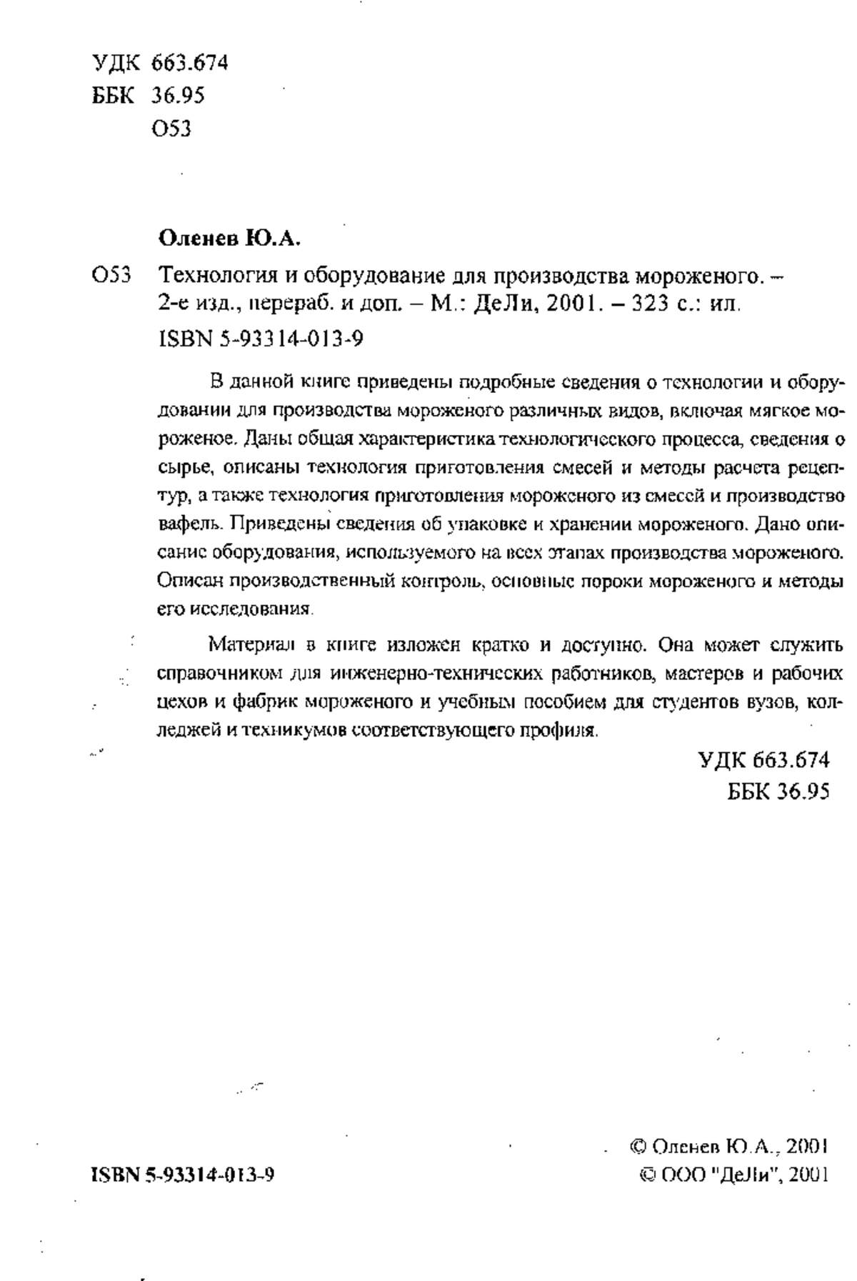 В данной книге приведены подробные сведения о технологии и оборудовании для производства мороженого различных видов, включая мягкое мороженое. Даны общая характеристика технологического процесса, сведения о сырье, описаны технология приготовления смесей и методы расчета рецептур, а также технология приготовления мороженого из смесей и производство вафель. Приведены сведения об упаковке и хранении мороженого. Дано описание оборудования, используемого на всех этапах производства мороженого. Описан производственный контроль, основные пороки мороженого и методы его исследования.