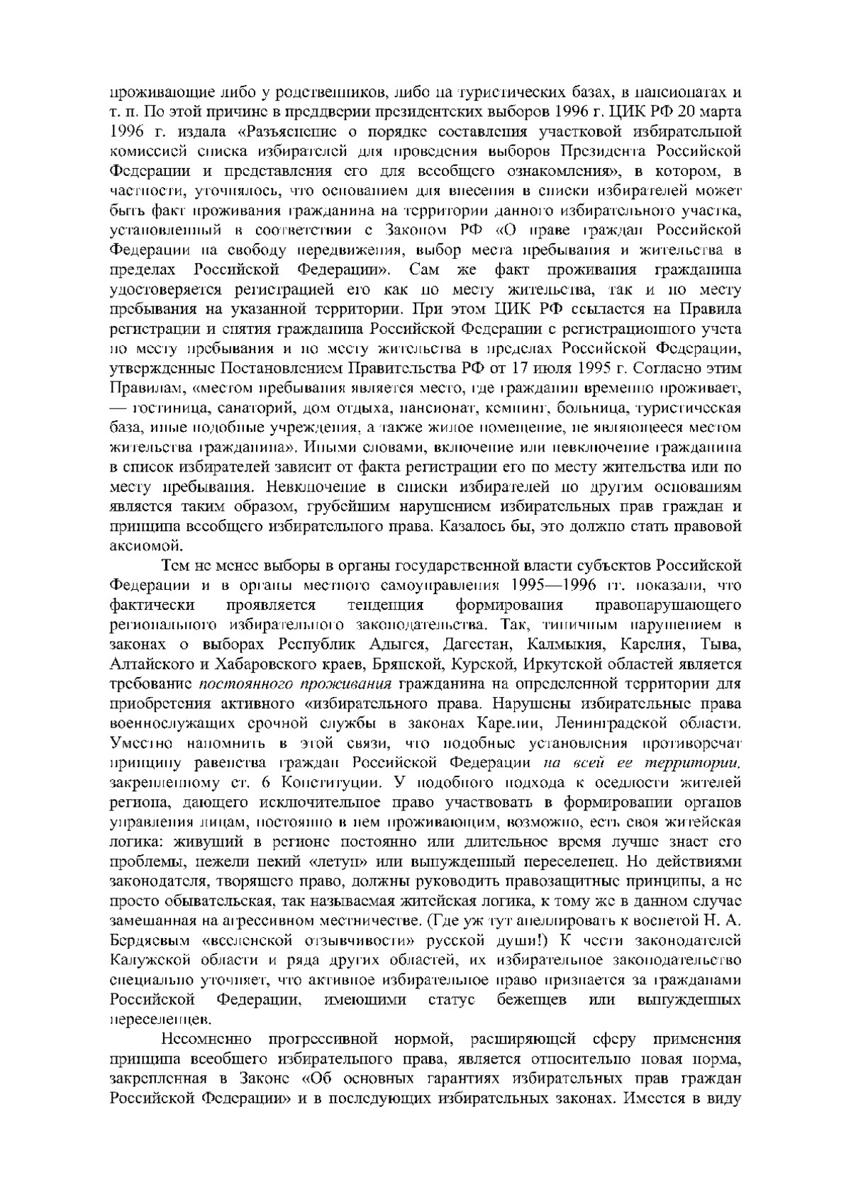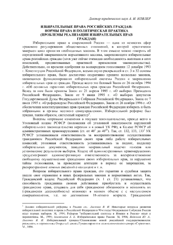 Избирательное право в современной России — одна из немногих сфер правового регулирования общественных отношений, в которой практически завершен цикл принятия необходимых законов. В этом смысле можно говорить об определенной завершенности нормативного массива, закрепляющего избирательные права российских граждан (хотя уже сейчас очевидна необходимость внесения в него изменений, продиктованных практикой применения законодательства). Действительно, со времени одобрения на всенародном голосовании 12 декабря 1993 г. Конституции Российской Федерации, весьма скупо раскрывшей в ст. 3 и 32 основы избирательного права, было достаточно оперативно принято несколько законов, касающихся функционирования избирательной системы России и закрепления избирательных прав ее граждан.