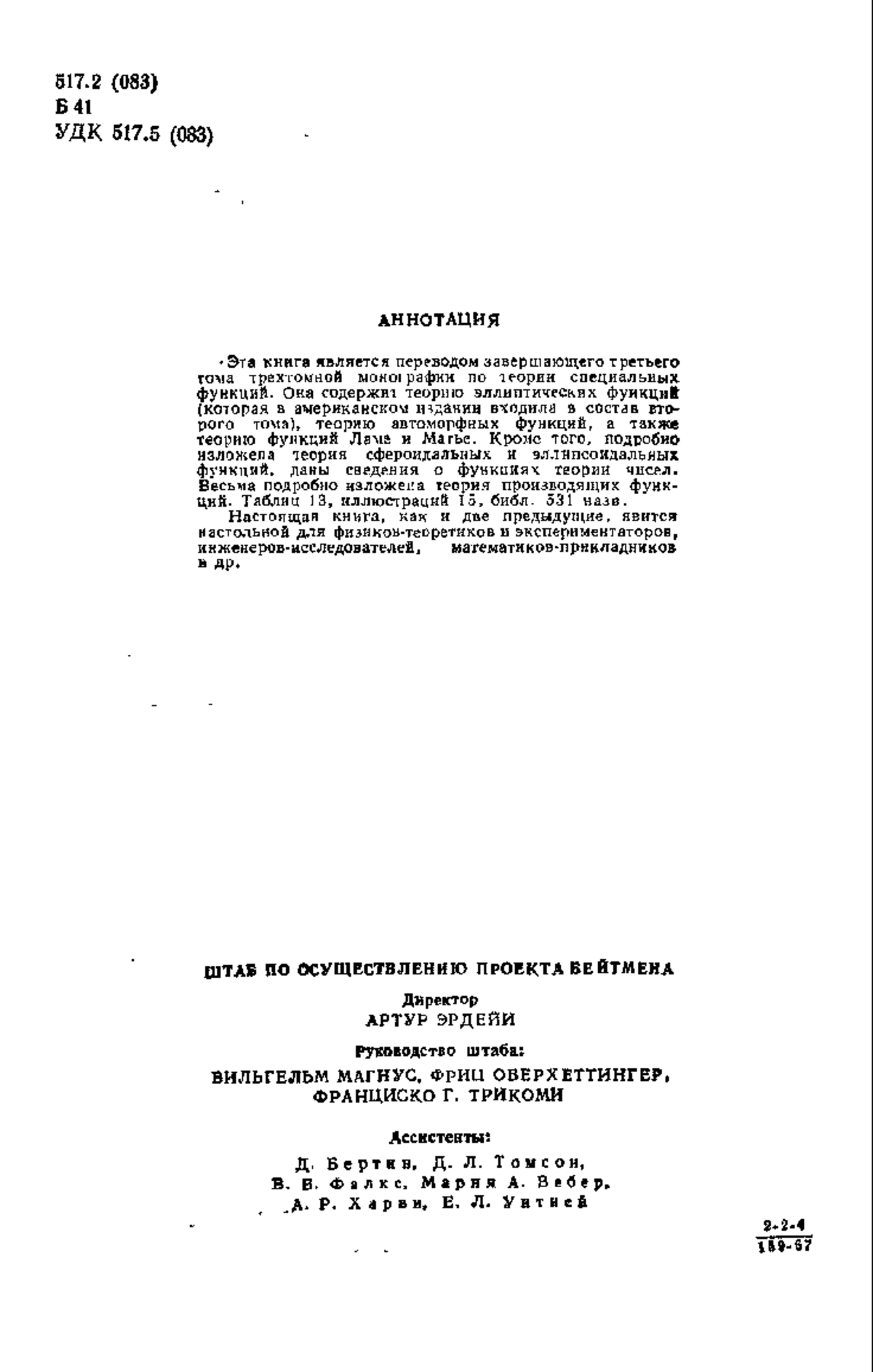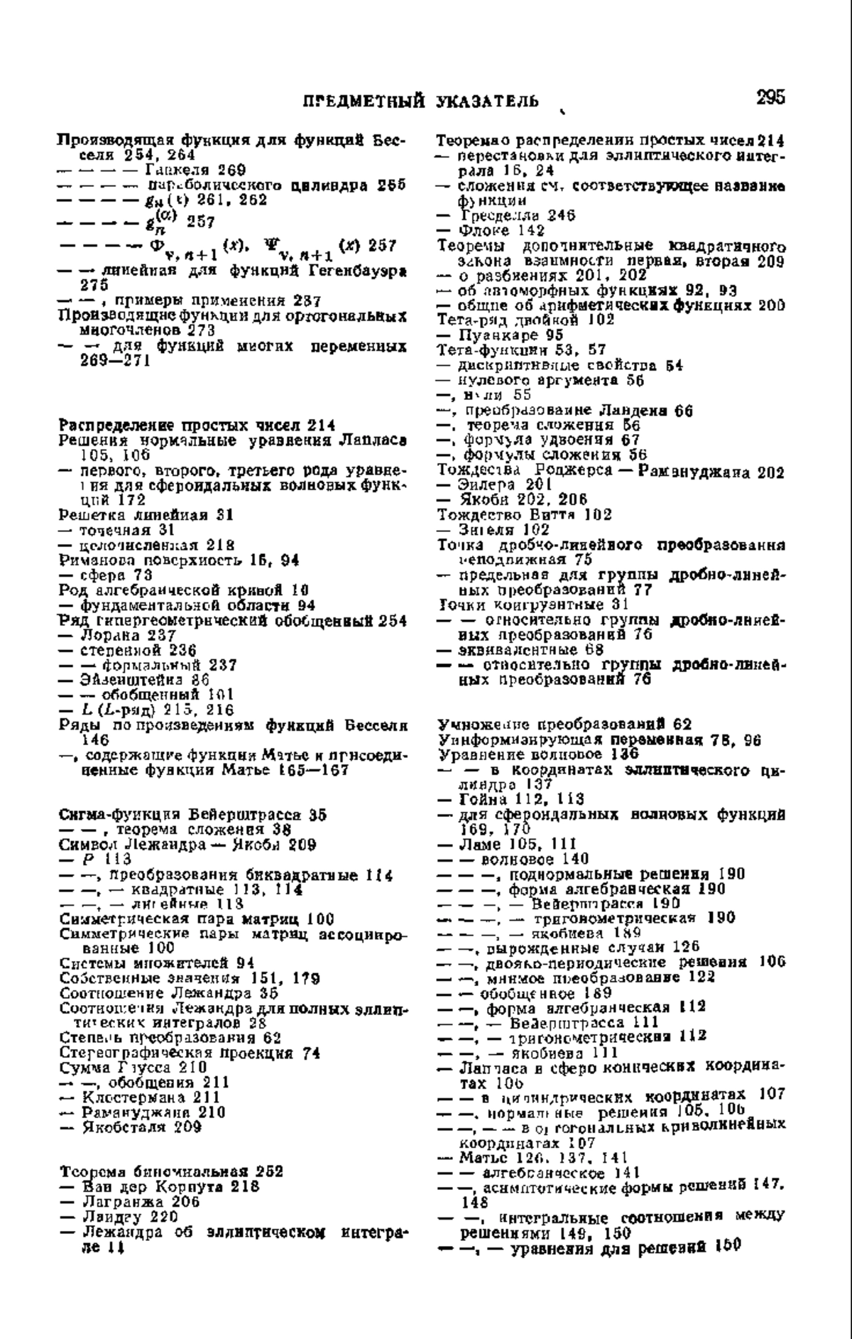 Кроме того, подробно изложена теория сфероидальных и эллипсоидальных функций, даны сведения о функциях теории чисел. Весьма подробно изложена теория производящих функций.