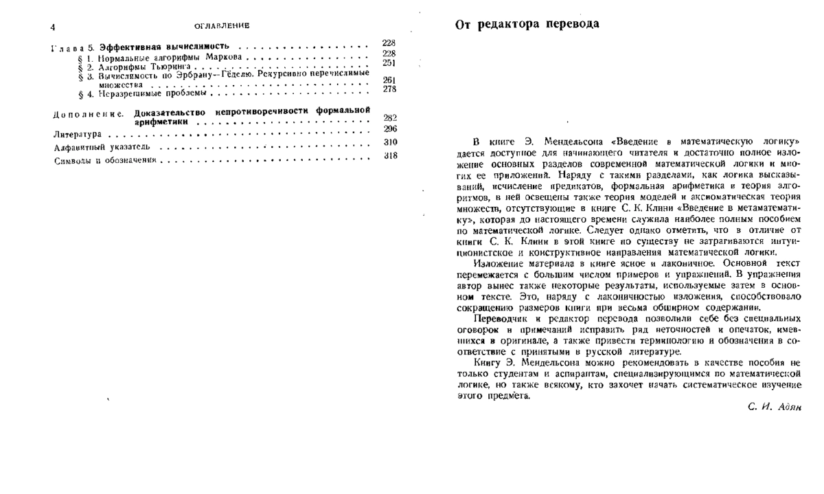 Наряду с такими разделами, как логика высказываний, исчисление предикатов, формальная арифметика и теория алгоритмов, в ней освещены также теория моделей и аксиоматическая теория множеств, отсутствующие в книге С. К. Клини «Введение в метаматематику», которая до настоящего времени служила наиболее полным пособием по математической логике. Следует, однако, отметить, что в отличие от книги С. К. Клини в этой книге по существу не затрагиваются интуиционистское и конструктивное направления математической логики.