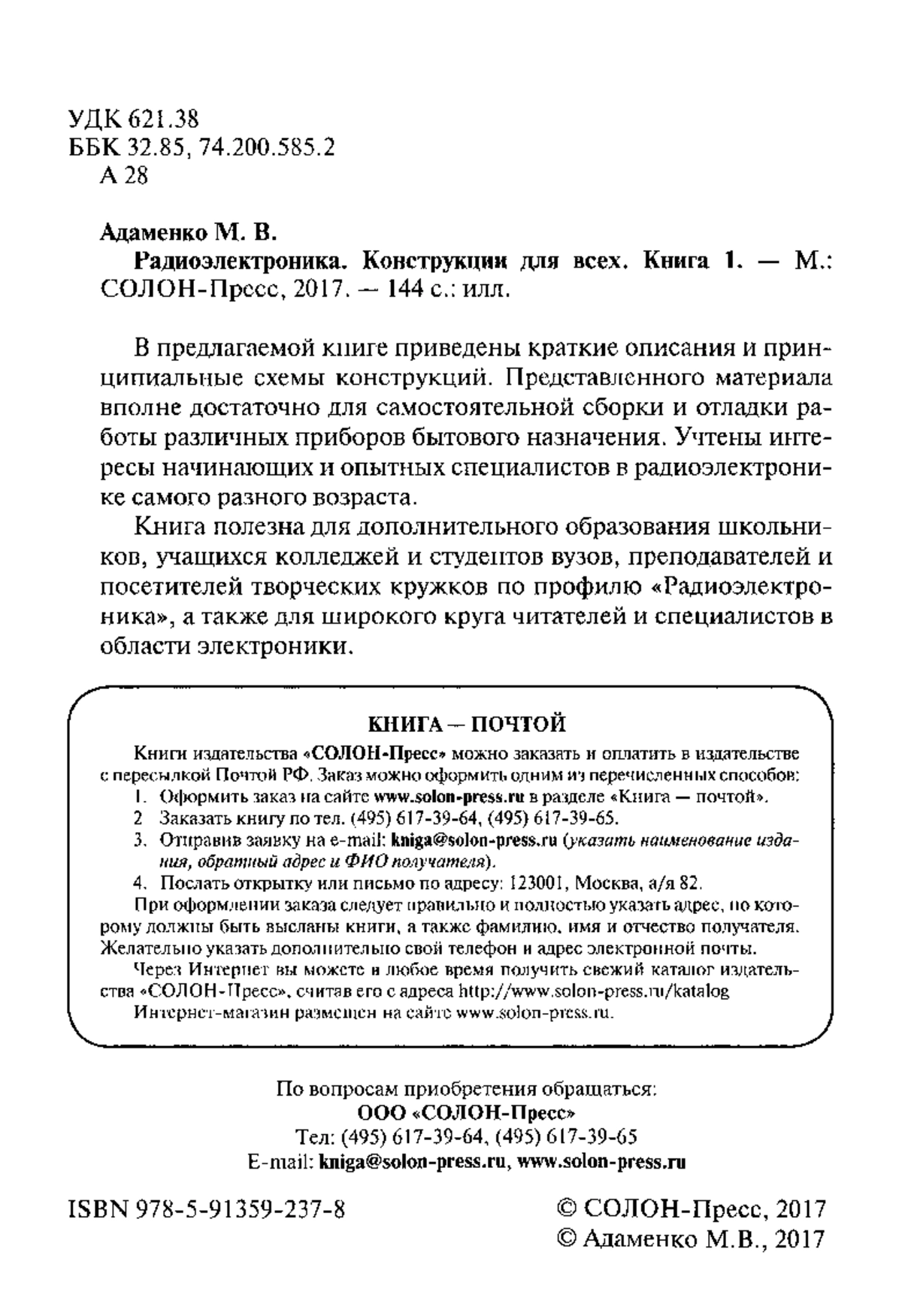 Книга полезна для дополнительного образования школьников, учащихся колледжей и студентов вузов, преподавателей и посетителей творческих кружков по профилю «Радиоэлектроника», а также для широкого круга читателей и специалистов в области электроники.