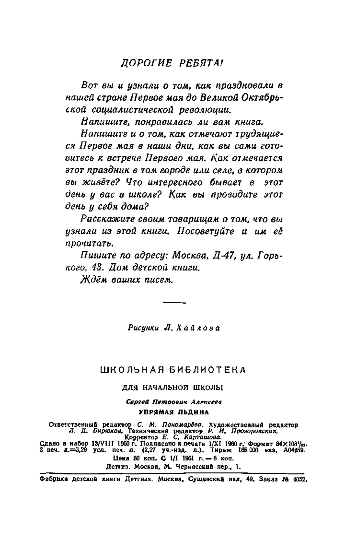 В 1866 году рабочие американского города Чикаго объявили забастовку. Капиталисты жестоко расправились с её участниками: несколько человек было казнено, многие брошены в тюрьмы. Забастовка американских рабочих произошла первого мая. В память об этом событии трудящиеся всех стран решили ежегодно отмечать Первое мая как день борьбы против угнетателей. Они договорились Первое мая объявить международным праздником — днём солидарности трудящихся всех стран. Из рассказов, вошедших в книгу «Упрямая льдина», вы узнаете, как отмечали Первое мая трудящиеся нашей родины до Великой Октябрьской социалистической революции. С особым интересом её прочтут школьники III—IV классов, овладевающие «Ступенями юного пионера».