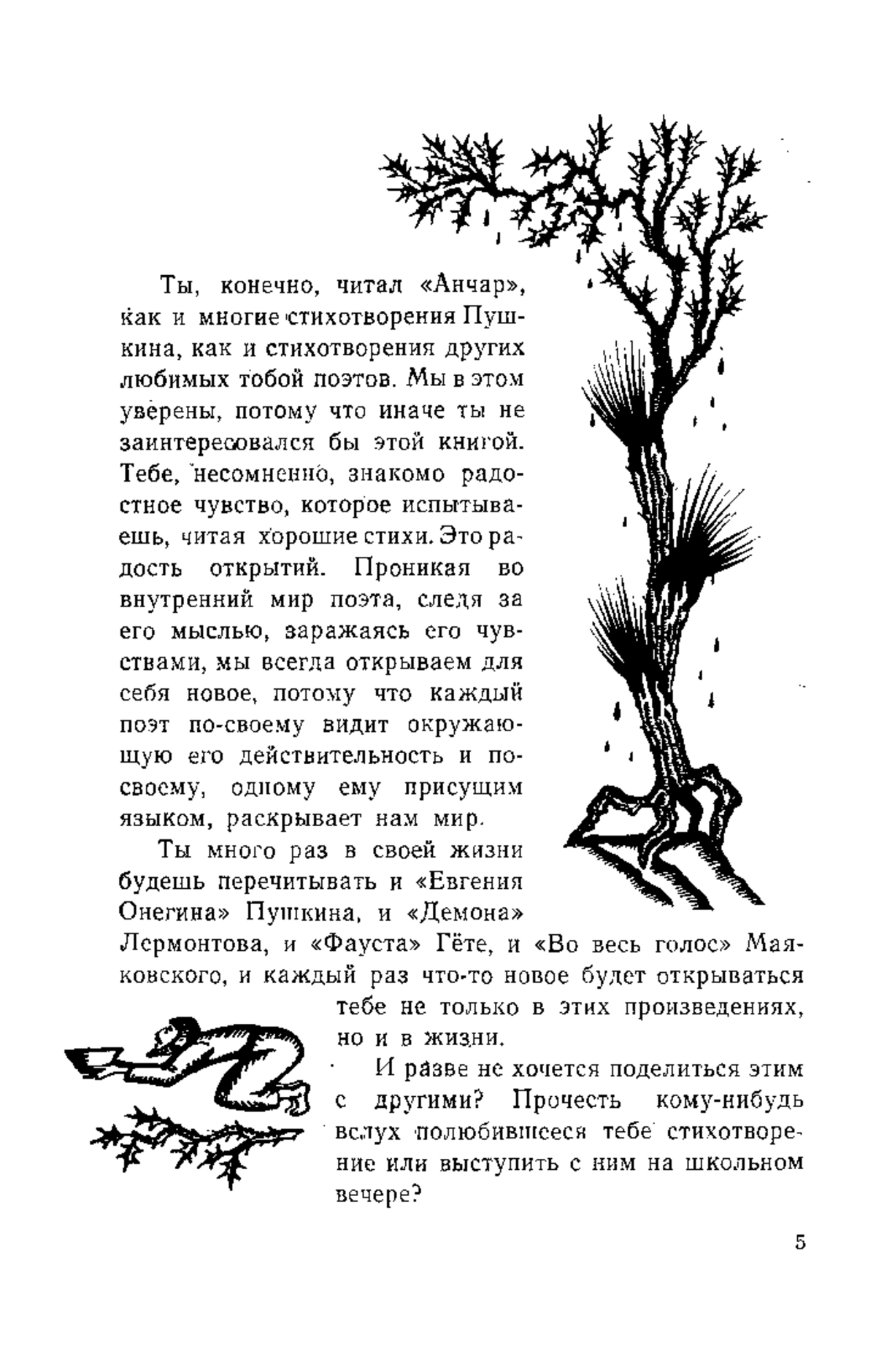 Ты много раз в своей жизни будешь перечитывать и «Евгения Онегина» Пушкина, и «Демона» Лермонтова, и «Фауста» Гёте, и «Во весь голос» Маяковского, и каждый раз что-то новое будет открываться тебе не только в этих произведениях, но и в жизни. И разве не хочется поделиться этим с другими? Прочесть кому-нибудь вслух полюбившееся тебе стихотворение или выступить с ним на школьном вечере? Часто приходится слышать: «Я люблю стихи, но одно дело, когда я их читаю про себя; а читать стихи другим очень трудно». Конечно, трудно. Чтение стихов вслух, или, как часто говорят, «художественное чтение», «декламация» — искусство. И овладеть им, как и любым другим видом искусства, можно, лишь затратив на это труд и время. Чтобы мысли и чувства поэта, заключенные в поэтических образах, ритмах и мелодии стиха, ты сумел передать слушателям, надо сначала самому хорошенько подумать и поработать над выбранным тобой стихотворением.