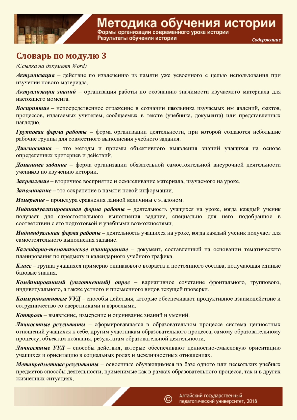 Учебно-методическое пособие состоит из четырех частей по количеству модулей, на которые разделен курс «Методика обучения истории». Третья часть учебно-методического пособия охватывает содержание третьего модуля дисциплины «Формы организации современного урока истории. Результаты обучения истории», в котором представлен теоретический материал по разделам IX–XI «Формы организации обучения истории», «Результаты обучения истории», «Современный урок истории». Пособие включает методическое обеспечение практических занятий по курсу – разноуровневые вопросы и задания, методические рекомендации по выполнению лабораторных работ, контрольный блок.