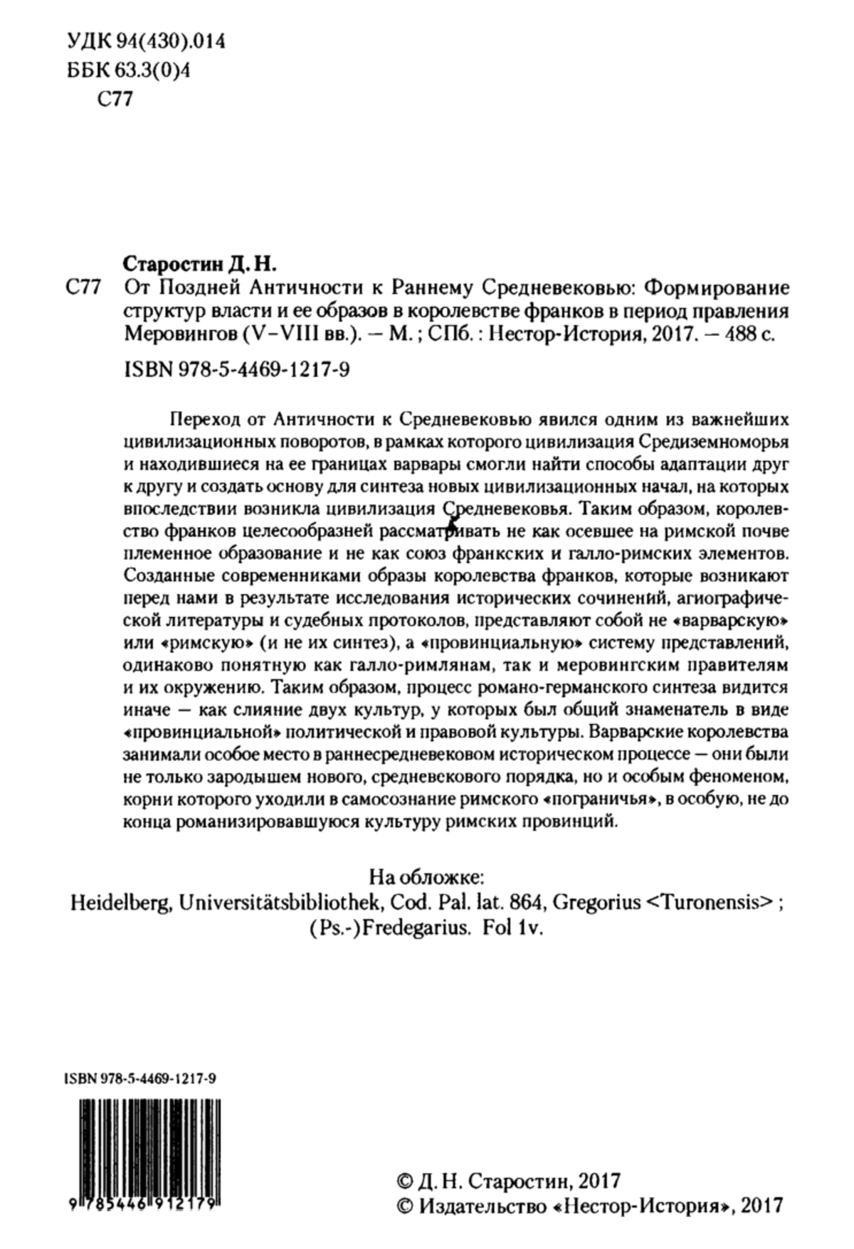 Переход от Античности к Средневековью явился одним из важнейших цивилизационных поворотов, в рамках которого цивилизация Средиземноморья и находившиеся на ее границах варвары смогли найти способы адаптации друг к другу и создать основу для синтеза новых цивилизационных начал, на которых впоследствии возникла цивилизация Средневековья. Таким образом, королев ство франков целесообразней рассматривать не как осевшее на римской почве племенное образование и не как союз франкских и галло-римских элементов. Созданные современниками образы королевства франков, которые возникают перед нами в результате исследования исторических сочинений, агиографиче ской литературы и судебных протоколов, представляют собой не «варварскую» или «римскую» (и не их синтез), а «провинциальную» систему представлений, одинаково понятную как галло-римлянам, так и меровингским правителям и их окружению. Таким образом, процесс романо-германского синтеза видится иначе — как слияние двух культур, у которых был общий знаменатель в виде «провинциальной» политической и правовой культуры. Варварские королевства занимали особое место в раннесредневековом историческом процессе —они были не только зародышем нового, средневекового порядка, но и особым феноменом, корни которого уходили в самосознание римского «пограничья», в особую, не до конца романизировавшуюся культуру римских провинций.