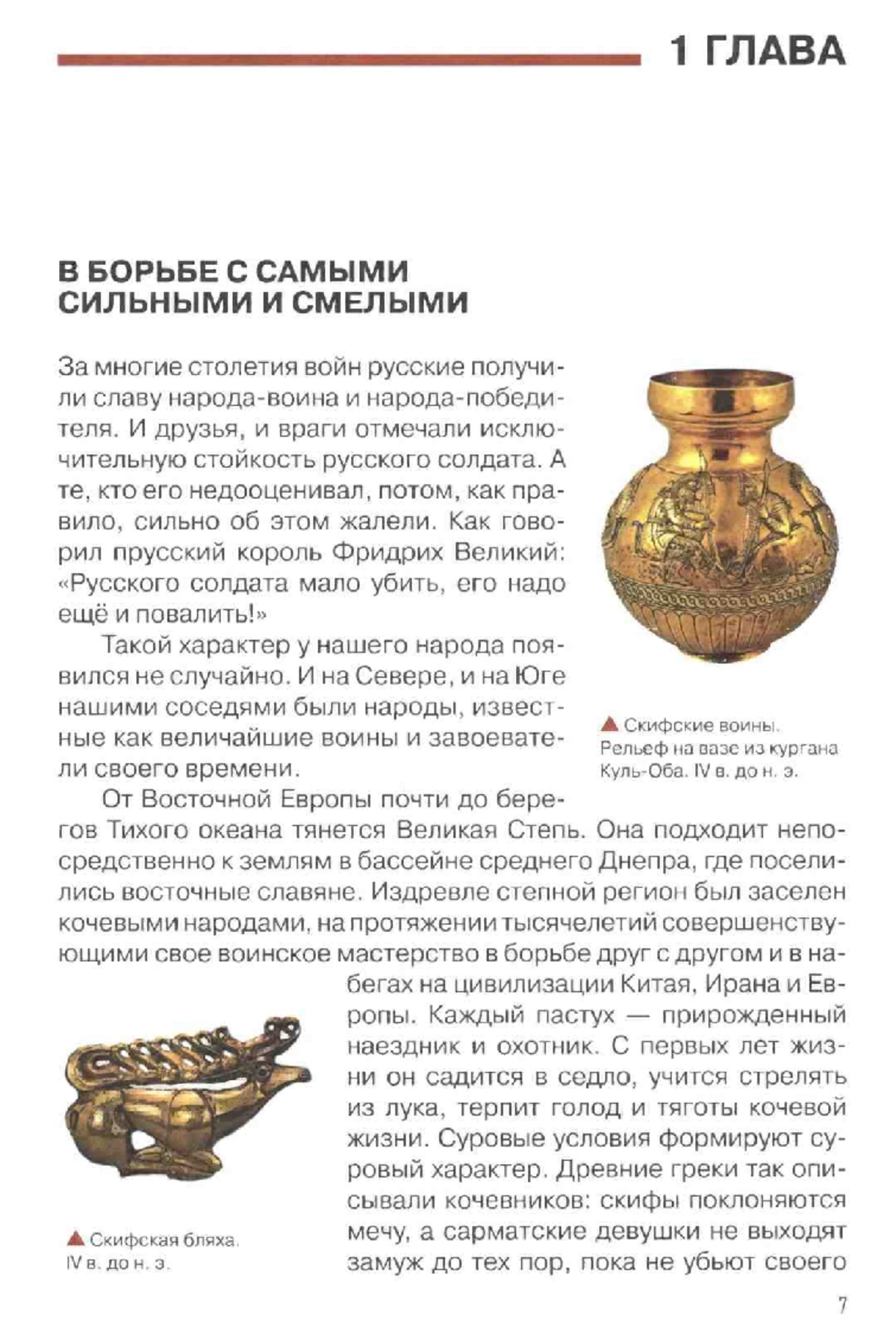 Эта книга адресована учащимся среднего и старшего школьного возраста, и тем, кто всерьёз подумывает о профессии военного, и тем, кто просто интересуется историей нашей страны. На её страницах история военного дела в России, развитие нашей армии, вооружений и техники предстают в увлекательной, яркой, запоминающейся форме. Рассказ о важнейших сражениях, выдающихся полководцах, героях, не жалевших жизни ради защиты Родины, сопровождается большим количеством красочных иллюстраций.