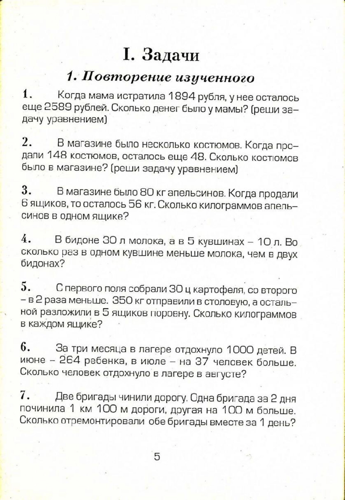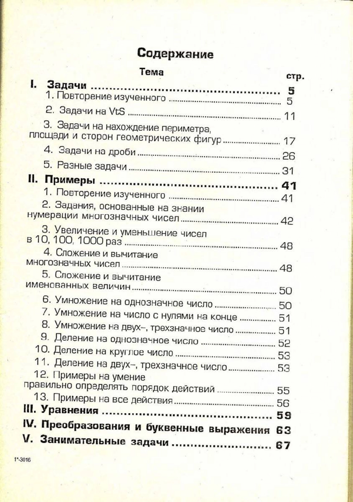 Цель сборника — дать учителям и родителям разнообразный материал для отработки всех типов задач, примеров, уравнений и преобразований. Приложение к этому пособию является два вида самостоятельных работ: “Реши задачу!” и “Попробуй реши!”(примеры, уравнения, неравенства, преобразования), а также сборник “Устный счет”, в котором даны контрольные работы по устному счету (по две на каждый месяц), проверочные работы по теме “Нумерация” и более 600 заданий для развития устного счета.