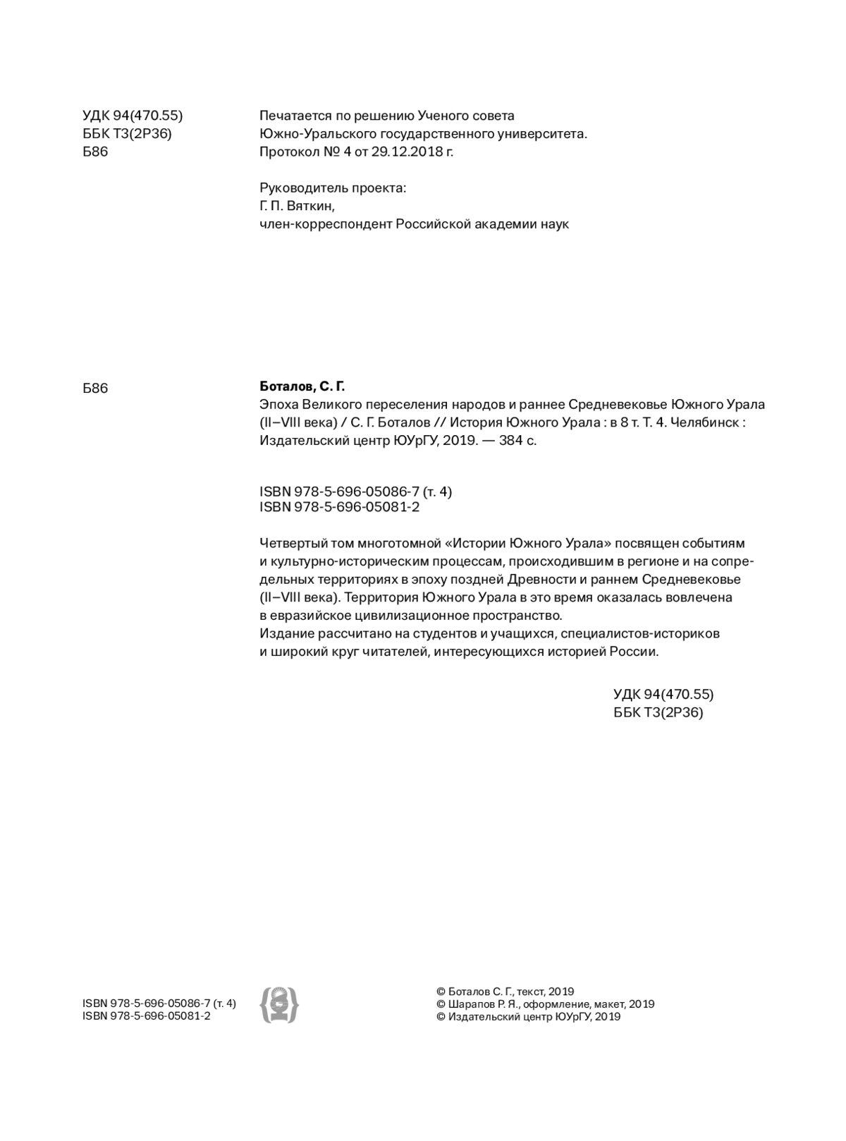 Четвертый том многотомной «Истории Южного Урала» посвящен событиям и культурно-историческим процессам, происходившим в регионе и на сопредельных территориях в эпоху поздней Древности и раннем Средневековье (II–VIII века). Территория Южного Урала в это время оказалась вовлечена в евразийское цивилизационное пространство.