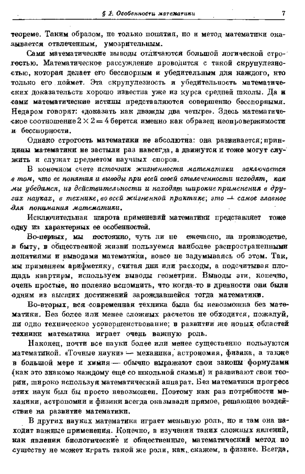 Возникшая еще в древности из практических потребностей, математика выросла в громадную систему разветвленных дисциплин. Как и другие науки, она отражает законы материальной действительности и служит могучим орудием познания и покорения природы. Но свойственный математике высокий уровень абстракции делает новые ее разделы сравнительно мало доступными для неспециалиста. Тот же отвлеченный характер математики порождал еще в древности идеалистические представления о ее независимости от материальной действительности.