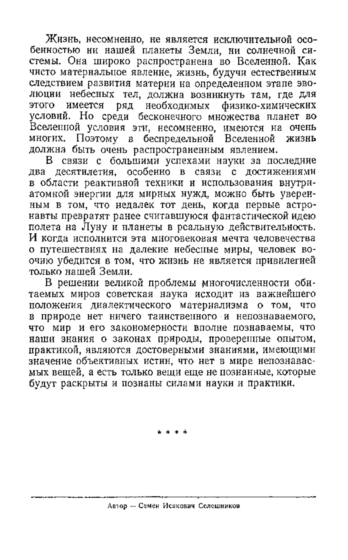 «Материализм считает, что природа, весь материальный мир существует независимо от нашего сознания, что материя первична, так как она является источником ощущений и представлений, а сознание, мышление вторично, так как является отображением материи, отображением бытия. Диалектический материализм учит, что материя существует вечно. Она никогда никем не создавалась и никогда не исчезнет. Материя существует независимо от нас и нашего сознания и находится в постоянном движении и изменении, переходя из одной формы в другую. Идеалистическое же мировоззрение объясняет мир, все явления природы и общества действием каких-то высших, сверхъестественных божественных сил. Идеализм находится в полном противоречии с действительностью, с подлинной наукой…»