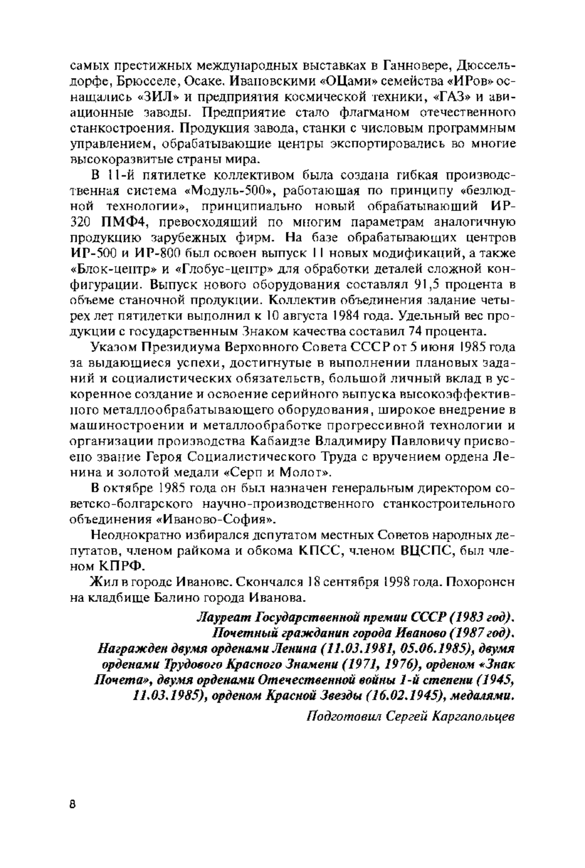 Первая книга серии «Жизнь замечательных ивановцев» посвящена Владимиру Павловичу Кабаидзе (24 января 1924, Владикавказ — 18 сентября 1998, Иваново) - участнику Великой Отечественной войны, генеральному директору Ивановского станкостроительного объединения имени 50-летия СССР (Ивановский завод тяжёлого станкостроения), генеральному директору международного научно-производственного объединения «Иваново-София», генеральному директору АО «Гестив» (Гертнер-станкоимпорт-Иваново), Герою Социалистического Труда, лауреату Государственной премии СССР, Почетному гражданину города Иванова, Почетному члену КПРФ.