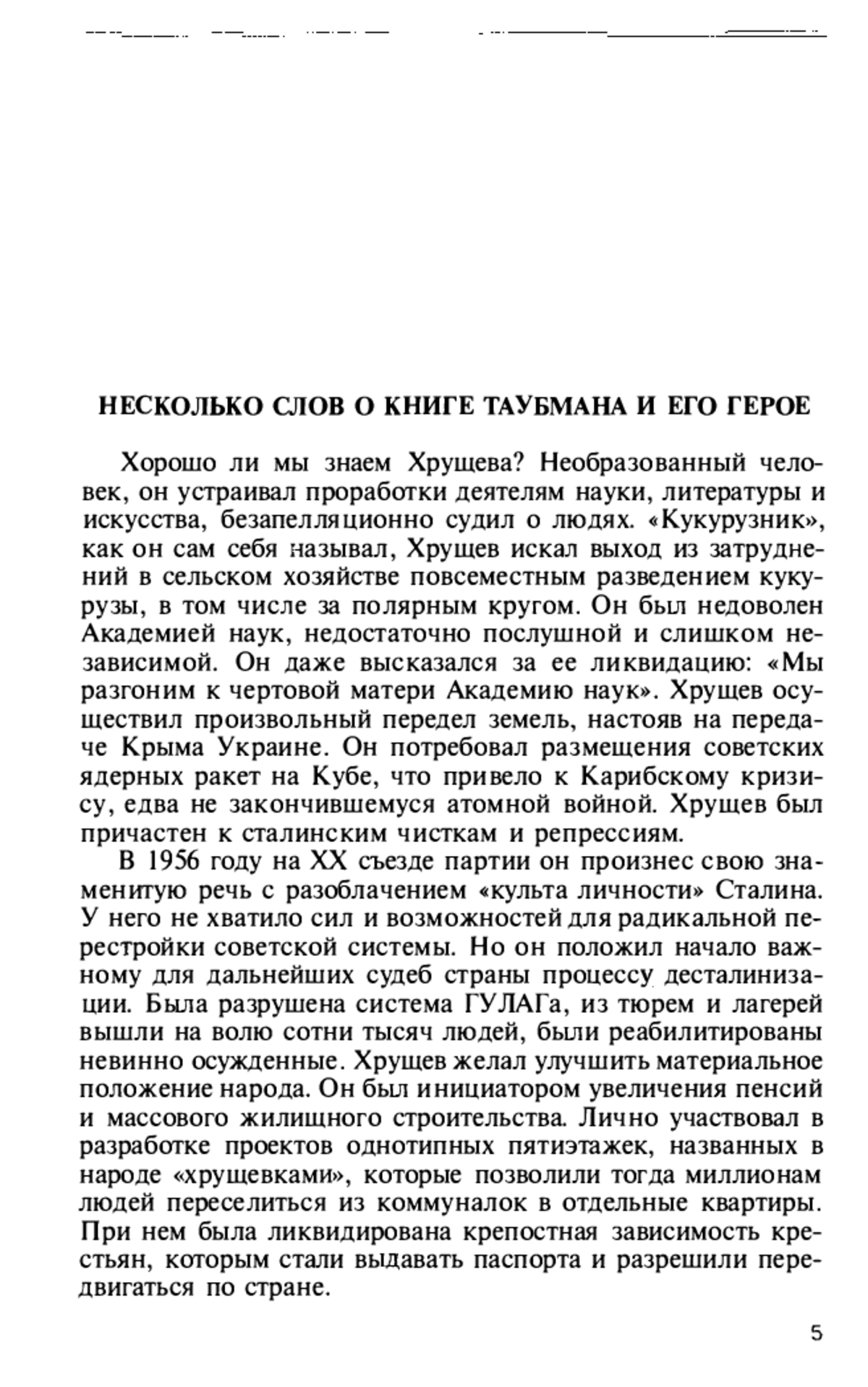 Никита Сергеевич Хрущев — человек, оставивший заметный след не только в советской, но и в мировой истории. Секретный доклад, положивший начало разоблачению культа личности Сталина, расколол страну, в глазах одних сделав его героем, в глазах других — предателем и выскочкой. Какой была его действительная роль в массовых репрессиях в Москве и на Украине, в восстановлении народного хозяйства СССР после Великой Отечественной войны, во всем том, чем запомнилась его эпоха? Автор, известный американский историк, тщательно и скрупулезно восстановил весь жизненный путь этого неординарного человека, собрав огромный, во многом уникальный материал, состоящий в том числе из архивных документов, а также записей бесед с людьми, хорошо знавшими Хрущева в разные периоды его жизни.