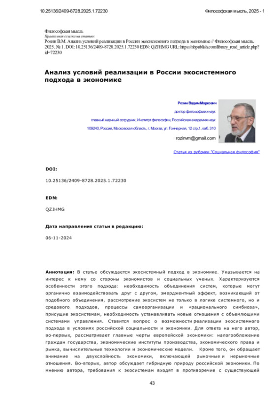 Статья: Анализ условий реализации в России экосистемного подхода в экономике