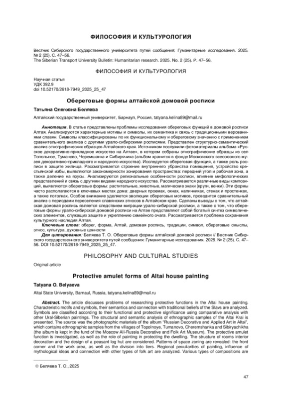 Статья: ОБЕРЕГОВЫЕ ФОРМЫ АЛТАЙСКОЙ ДОМОВОЙ РОСПИСИ