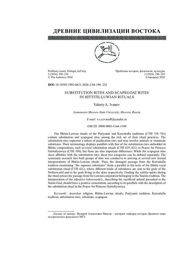 Записанные клинописью на глиняных табличках хетто-лувийские ритуалы, принадлежащие к традициям Пуриянни и Куватталлы (CTH 758-763), названным по именам их авторов, состоят из множества более мелких обрядов, в число которых входят также подменные обряды и обряды козла отпущения. Подменные обряды заключались в перемещении нечистоты с заказчика ритуала на животное или неодушевлённую фигурку (заместителя) с последующим его уничтожением. Терминология хетто-лувийских подменных обрядов имеет параллели с хеттскими царскими подменными ритуалами (CTH 419-421) и молитвой за царевну Гассулиявию (CTH 380). Обряды козлов отпущения имеют сходства с подменными обрядами, но эти две категории нужно рассматривать раздельно. Представленный в исследовании систематический анализ обрядов обоих видов позволил прийти к новым интерпретациям хетто-лувийских ритуалов. Так, плохо сохранившийся пассаж из традиции Куватталлы, упоминающий «верхних заместителей», можно объяснить с помощью параллели из хеттского царского подменного ритуала (CTH 421), где разные виды заместителей (живые и неодушевлённые) предназначены для разных групп богов: небесных божеств и богов Подземного мира. Упомянутый в хетто-лувийских ритуалах обряд кормления духов nakkiu- отражён тексте лувийского заговора, принадлежащего к текстам так называемой традиции города Таурисы (CTH 764-766). Также на основе параллели с Молитвой за царевну Гассулиявию (CTH 380) автор приходит к выводу, что прилагательное šaknuwant ( i )-, которым в ритуалах Куватталлы описывается посвящаемое богу Грозы животное, должно описывать положительные характеристики жертвы.