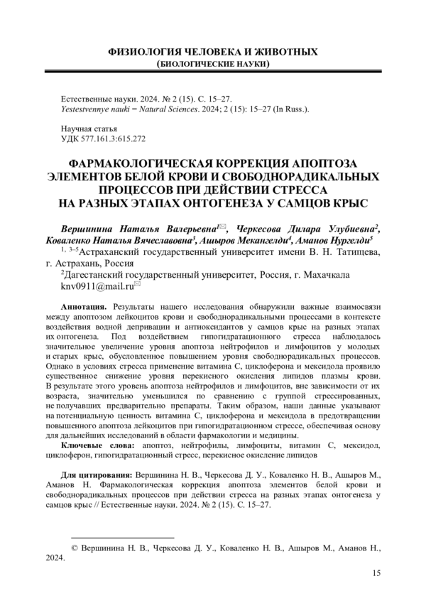 Результаты нашего исследования обнаружили важные взаимосвязи между апоптозом лейкоцитов крови и свободнорадикальными процессами в контексте воздействия водной депривации и антиоксидантов у самцов крыс на разных этапах их онтогенеза. Под воздействием гипогидратационного стресса наблюдалось значительное увеличение уровня апоптоза нейтрофилов и лимфоцитов у молодых и старых крыс, обусловленное повышением уровня свободнорадикальных процессов. Однако в условиях стресса применение витамина С, циклоферона и мексидола проявило существенное снижение уровня перекисного окисления липидов плазмы крови. В результате этого уровень апоптоза нейтрофилов и лимфоцитов, вне зависимости от их возраста, значительно уменьшился по сравнению с группой стрессированных, не получавших предварительно препараты. Таким образом, наши данные указывают на потенциальную ценность витамина С, циклоферона и мексидола в предотвращении повышенного апоптоза лейкоцитов при гипогидратационном стрессе, обеспечивая основу для дальнейших исследований в области фармакологии и медицины.