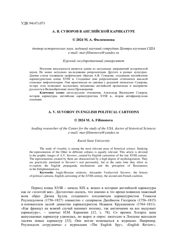 Изучение визуальности является одним из актуальных направлений исторической науки. Не менее актуально исследование репрезентации Другого в разных культурах. Данная статья посвящена графическим образам А.В. Суворова, созданным английскими карикатуристами конца XVIII в. Созданные ими репрезентации отличаются высокой степенью мифологизации. Они практически не связаны с реальной личностью Суворова, но при этом позволяют исследовать механизмы английской пропаганды и восприятие русскости в Великобритании эпохи Просвещения.
