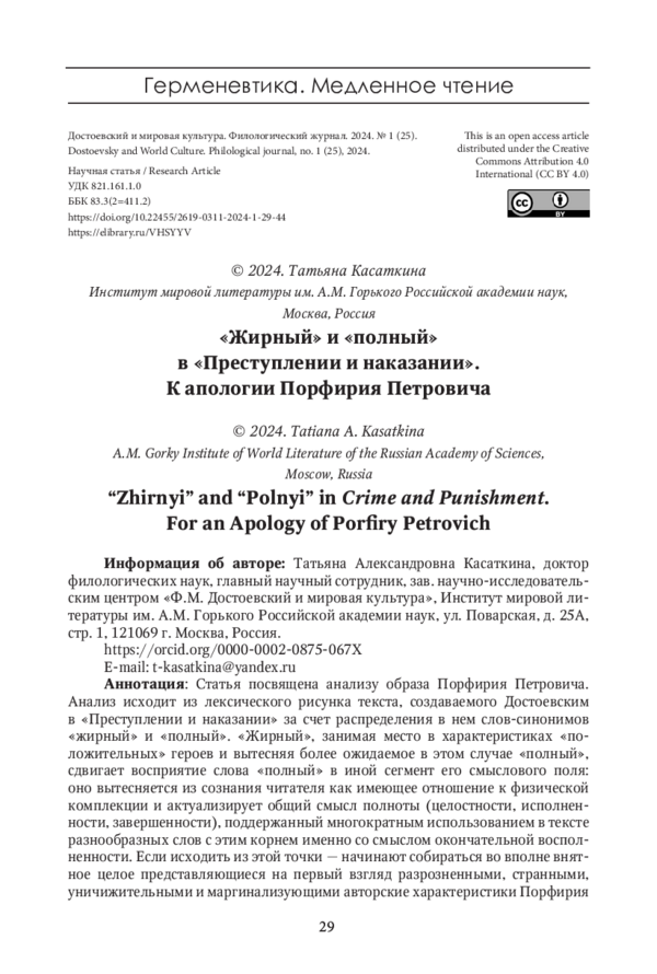 Статья: "ЖИРНЫЙ" И "ПОЛНЫЙ" В "ПРЕСТУПЛЕНИИ И НАКАЗАНИИ". К АПОЛОГИИ ПОРФИРИЯ ПЕТРОВИЧА