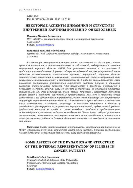 Статья: НЕКОТОРЫЕ АСПЕКТЫ ДИНАМИКИ И СТРУКТУРЫ ВНУТРЕННЕЙ КАРТИНЫ БОЛЕЗНИ У ОНКОБОЛЬНЫХ