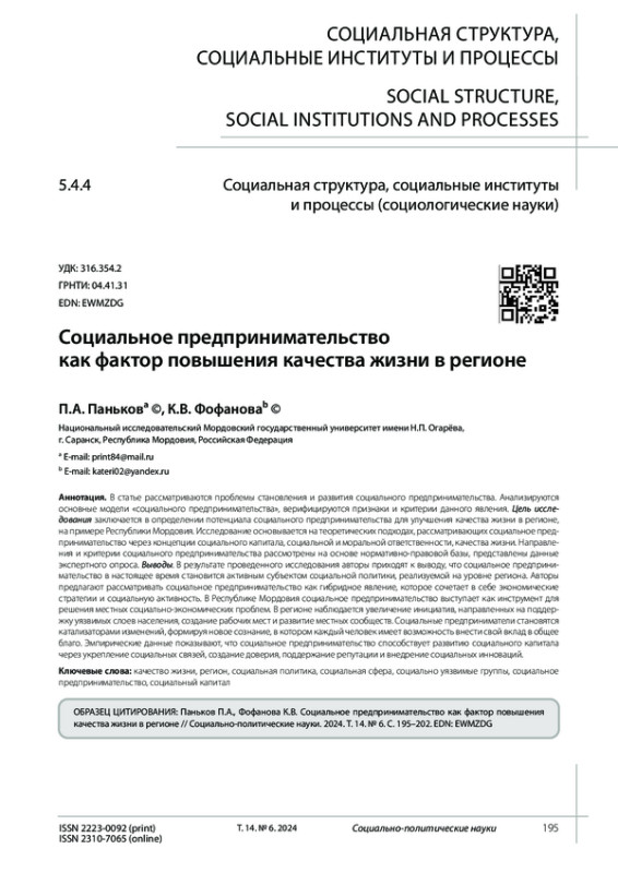В статье рассматриваются проблемы становления и развития социального предпринимательства. Анализируются основные модели «социального предпринимательства», верифицируются признаки и критерии данного явления. Цель исследования заключается в определении потенциала социального предпринимательства для улучшения качества жизни в регионе, на примере Республики Мордовия. Исследование основывается на теоретических подходах, рассматривающих социальное предпринимательство через концепции социального капитала, социальной и моральной ответственности, качества жизни. Направления и критерии социального предпринимательства рассмотрены на основе нормативно-правовой базы, представлены данные экспертного опроса. Выводы. В результате проведенного исследования авторы приходят к выводу, что социальное предпринимательство в настоящее время становится активным субъектом социальной политики, реализуемой на уровне региона. Авторы предлагают рассматривать социальное предпринимательство как гибридное явление, которое сочетает в себе экономические стратегии и социальную активность. В Республике Мордовия социальное предпринимательство выступает как инструмент для решения местных социально-экономических проблем. В регионе наблюдается увеличение инициатив, направленных на поддержку уязвимых слоев населения, создание рабочих мест и развитие местных сообществ. Социальные предприниматели становятся катализаторами изменений, формируя новое сознание, в котором каждый человек имеет возможность внести свой вклад в общее благо. Эмпирические данные показывают, что социальное предпринимательство способствует развитию социального капитала через укрепление социальных связей, создание доверия, поддержание репутации и внедрение социальных инноваций.