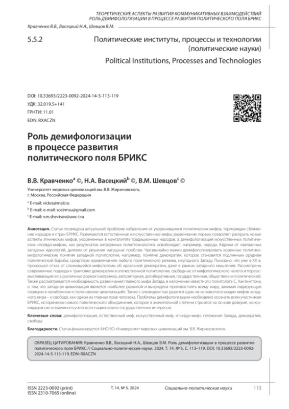 Статья: РОЛЬ ДЕМИФОЛОГИЗАЦИИ В ПРОЦЕССЕ РАЗВИТИЯ ПОЛИТИЧЕСКОГО ПОЛЯ БРИКС