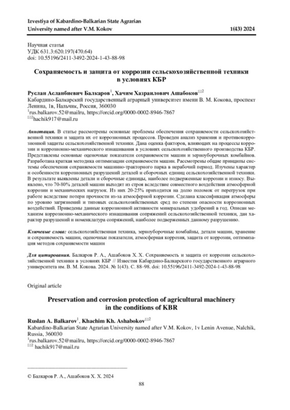 Статья: СОХРАНЯЕМОСТЬ И ЗАЩИТА ОТ КОРРОЗИИ СЕЛЬСКОХОЗЯЙСТВЕННОЙ ТЕХНИКИ В УСЛОВИЯХ КБР