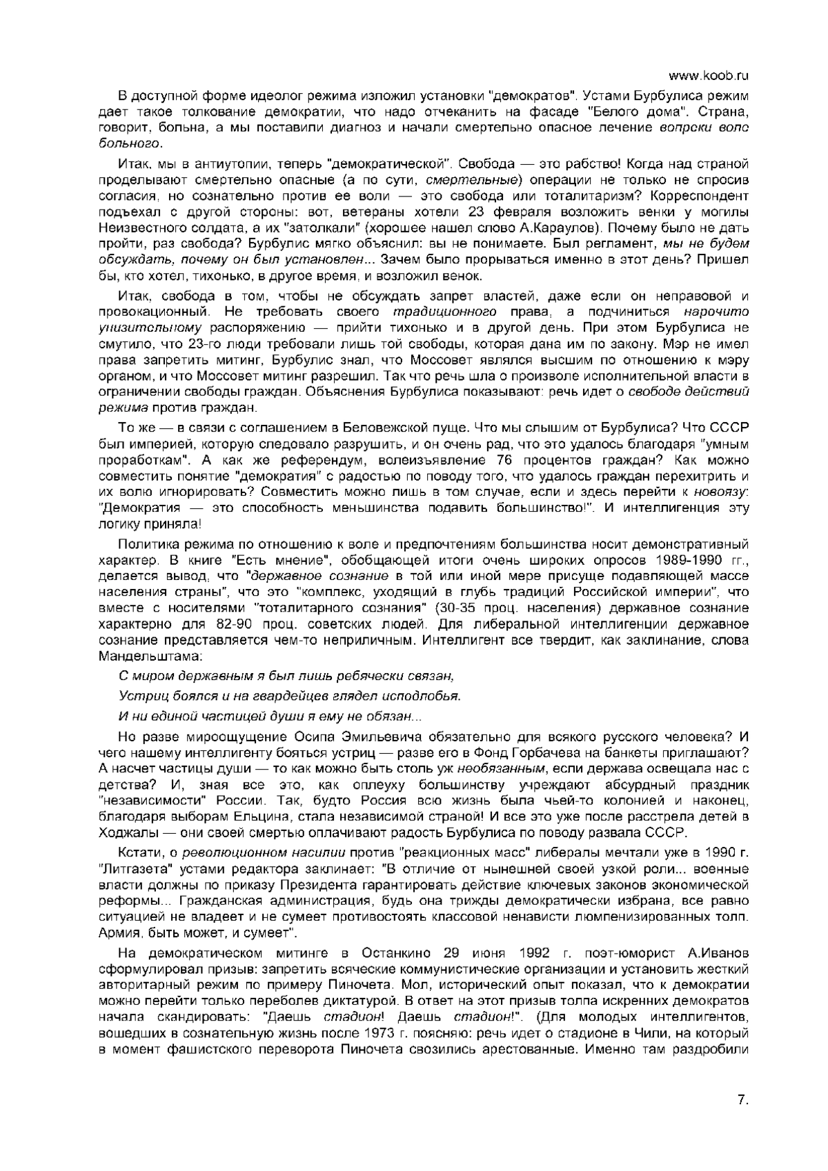 “Что делать интеллигенции? Не она разожгла костер — она лишь “сформулировала”, дала поджигателям язык, нашла слова.” (Лев Аннинский). Насколько важна эта книга, говоpит уже тот факт, что за 16 лет только на испанском языке вышло 20 ее изданий. Автор “жжот” по полной, чего только стоят формулировки “русский народ как мутант человечества”, “антропологическая концепция перестройки”, “духовный стриптиз лицедеев”.