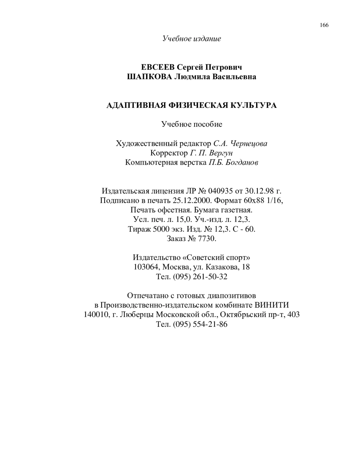 Учебное пособие предназначено для студентов высших учебных заведений, учащихся техникумов и колледжей, изучающих адаптивную физическую культуру, а также аспирантов и преподавателей, проводящих научно-исследовательскую работу в этой области.